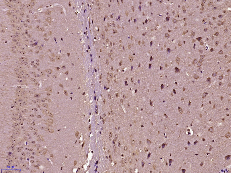Paraformaldehyde-fixed, paraffin embedded (Mouse brain); Antigen retrieval by boiling in sodium citrate buffer (pH6.0) for 15min; Block endogenous peroxidase by 3% hydrogen peroxide for 20 minutes; Blocking buffer (normal goat serum) at 37°C for 30min; Antibody incubation with (RANBP16/Exp7) Polyclonal Antibody, Unconjugated (bs-21151R) at 1:400 overnight at 4°C, followed by operating according to SP Kit(Rabbit) (sp-0023) instructionsand DAB staining.
