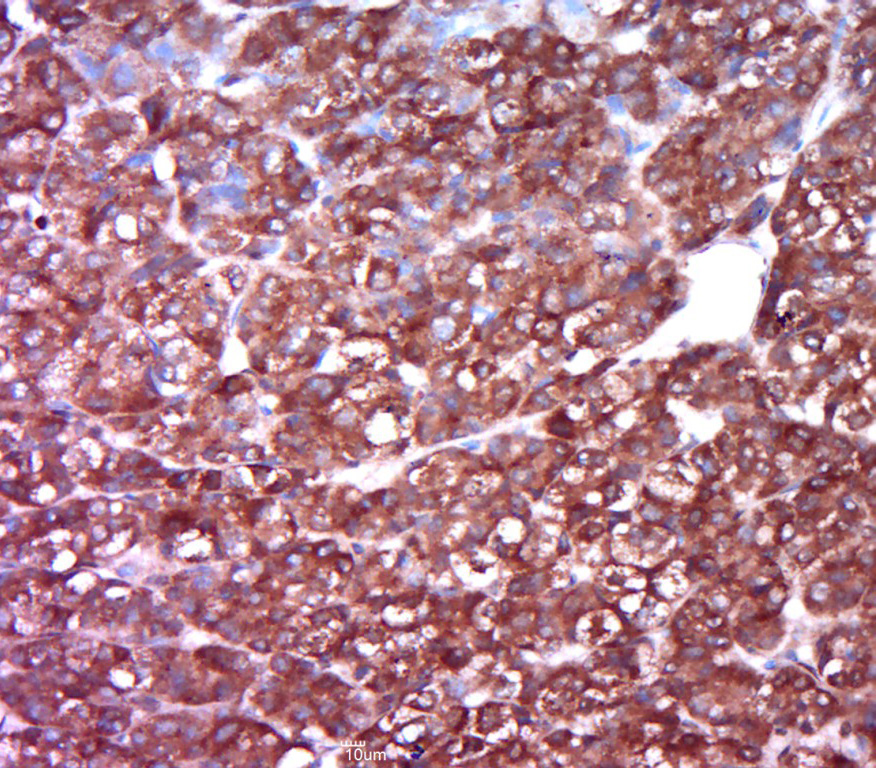 Paraformaldehyde-fixed, paraffin embedded (human liver carcinoma); Antigen retrieval by boiling in sodium citrate buffer (pH6.0) for 15min; Block endogenous peroxidase by 3% hydrogen peroxide for 20 minutes; Blocking buffer (normal goat serum) at 37°C for 30min; Antibody incubation with (SLC22A11) Polyclonal Antibody, Unconjugated (bs-20723R) at 1:400 overnight at 4°C, followed by a conjugated secondary (sp-0023) for 20 minutes and DAB staining.