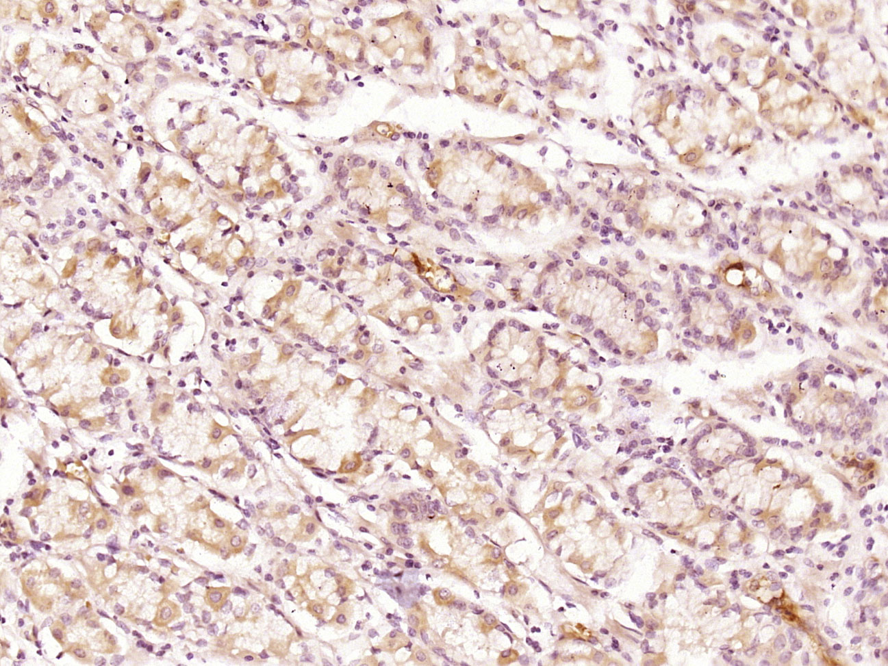 Paraformaldehyde-fixed, paraffin embedded (Human stomach carcinoma); Antigen retrieval by boiling in sodium citrate buffer (pH6.0) for 15min; Block endogenous peroxidase by 3% hydrogen peroxide for 20 minutes; Blocking buffer (normal goat serum) at 37°C for 30min; Antibody incubation with (CCL27) Polyclonal Antibody, Unconjugated (bs-20466R) at 1:500 overnight at 4°C, followed by a conjugated secondary (sp-0023) for 20 minutes and DAB staining.