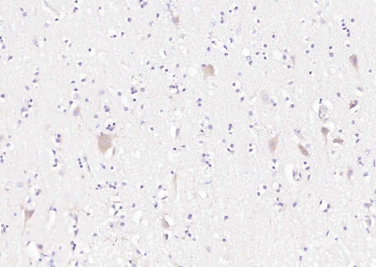 Paraformaldehyde-fixed, paraffin embedded (human brain); Antigen retrieval by boiling in sodium citrate buffer (pH6.0) for 15min; Block endogenous peroxidase by 3% hydrogen peroxide for 20 minutes; Blocking buffer (normal goat serum) at 37°C for 30min; Antibody incubation with (Phospho-SMAD7 (Ser249) ) Polyclonal Antibody, Unconjugated (bs-20024R) at 1:200 overnight at 4°C, followed by operating according to SP Kit(Rabbit) (sp-0023) instructionsand DAB staining.
