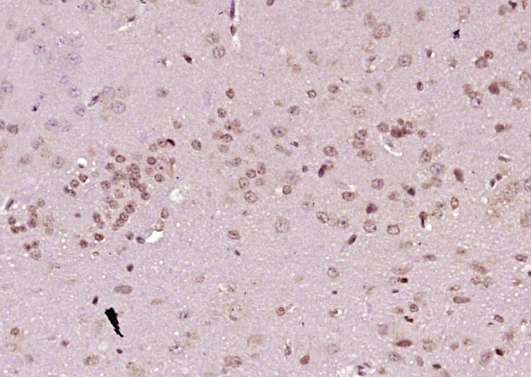 Paraformaldehyde-fixed, paraffin embedded (Rat brain); Antigen retrieval by boiling in sodium citrate buffer (pH6.0) for 15min; Block endogenous peroxidase by 3% hydrogen peroxide for 20 minutes; Blocking buffer (normal goat serum) at 37°C for 30min; Antibody incubation with (Phospho-SMAD7 (Ser249)) Polyclonal Antibody, Unconjugated (bs-20024R) at 1:400 overnight at 4°C, followed by operating according to SP Kit(Rabbit) (sp-0023) instructionsand DAB staining.