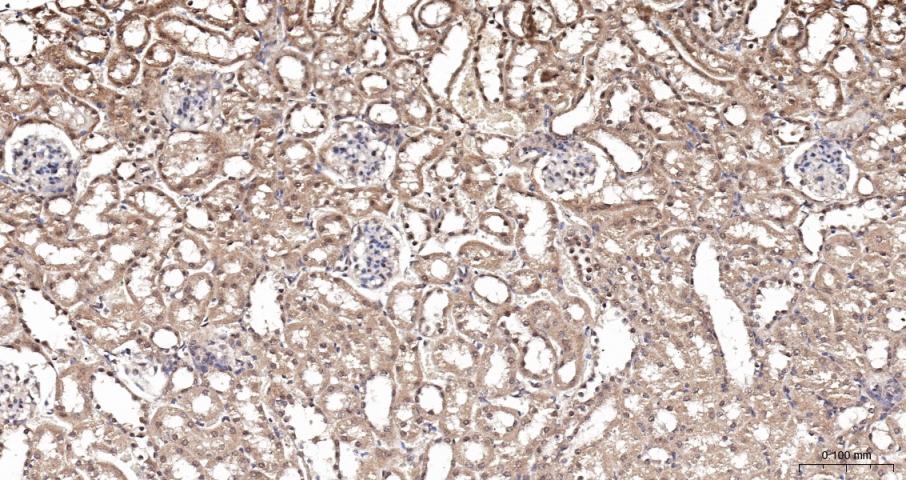 Paraformaldehyde-fixed, paraffin embedded Mouse Kidney; Antigen retrieval by boiling in sodium citrate buffer (pH6.0) for 15 min; The section was incubated with GPR30 Polyclonal Antibody, Unconjugated (bs-20642R) at 1:200 overnight at 4°C, followed by conjugation to the bs-0295G-HRP and DAB (C-0010) staining.