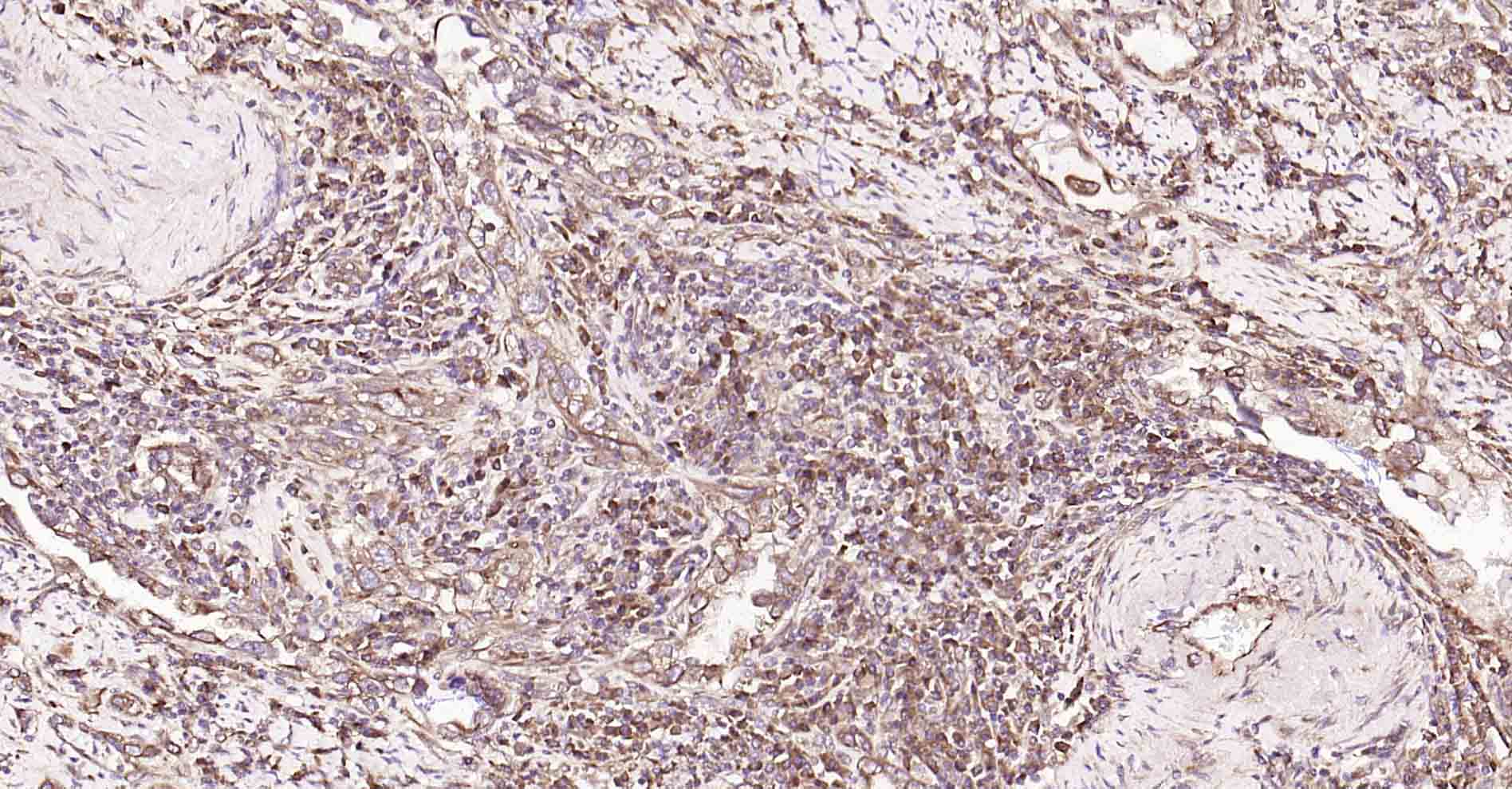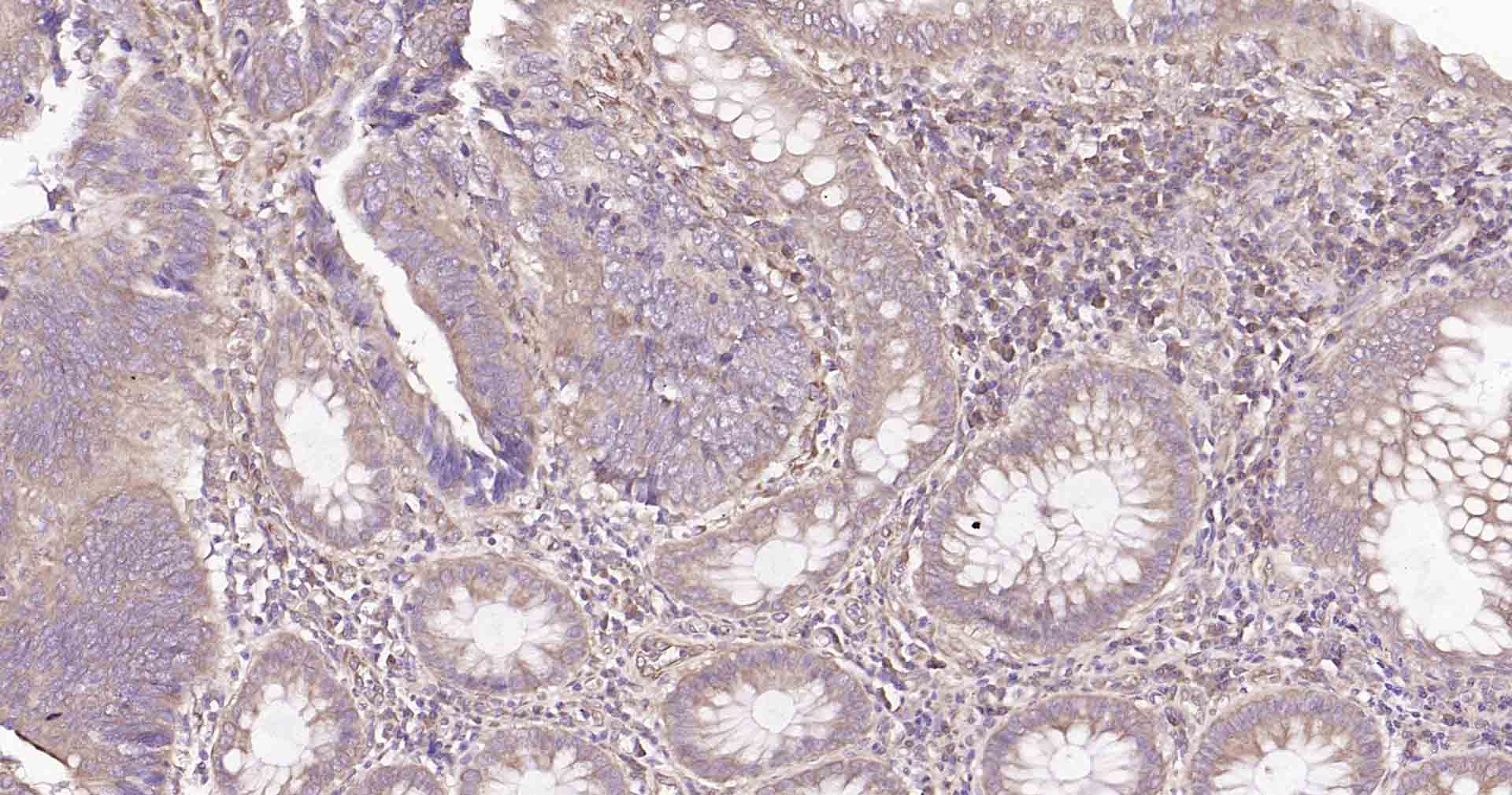 Paraformaldehyde-fixed, paraffin embedded Human Colon Cancer; Antigen retrieval by boiling in sodium citrate buffer (pH6.0) for 15 min; Antibody incubation with DDIT3 Polyclonal Antibody, Unconjugated (bs-20669R) at 1:200 overnight at 4°C, followed by conjugation to the SP Kit (Rabbit, SP-0023) and DAB (C-0010) staining.