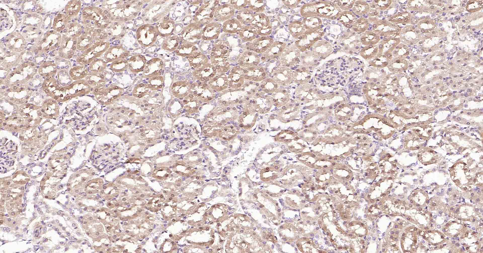 Paraformaldehyde-fixed, paraffin embedded Rat Kidney; Antigen retrieval by boiling in sodium citrate buffer (pH6.0) for 15 min; Antibody incubation with DDIT3 Polyclonal Antibody, Unconjugated (bs-20669R) at 1:200 overnight at 4°C, followed by conjugation to the SP Kit (Rabbit, SP-0023) and DAB (C-0010) staining.