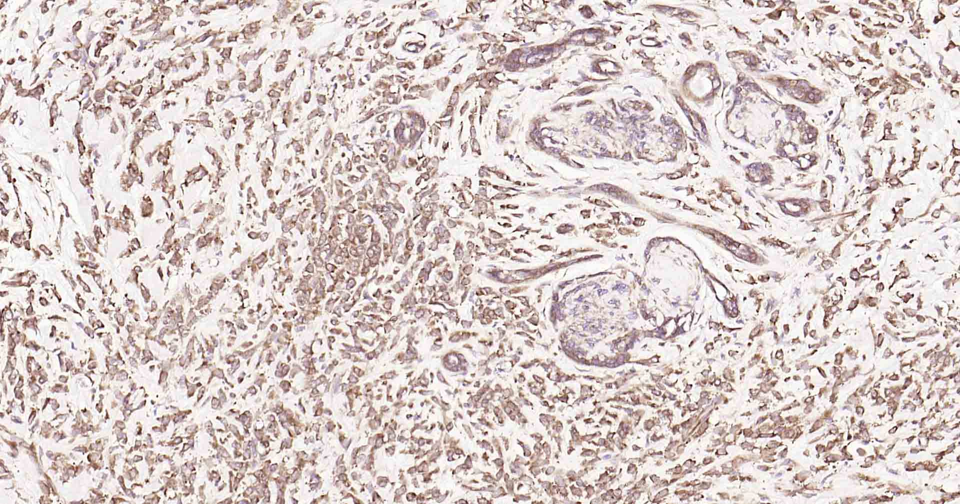 Paraformaldehyde-fixed, paraffin embedded Human Breast Cancer; Antigen retrieval by boiling in sodium citrate buffer (pH6.0) for 15 min; Antibody incubation with DDIT3 Polyclonal Antibody, Unconjugated (bs-20669R) at 1:200 overnight at 4°C, followed by conjugation to the SP Kit (Rabbit, SP-0023) and DAB (C-0010) staining.