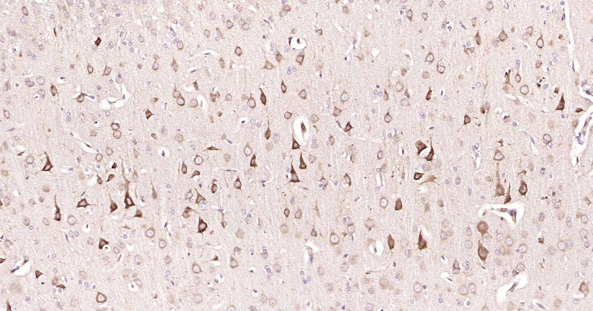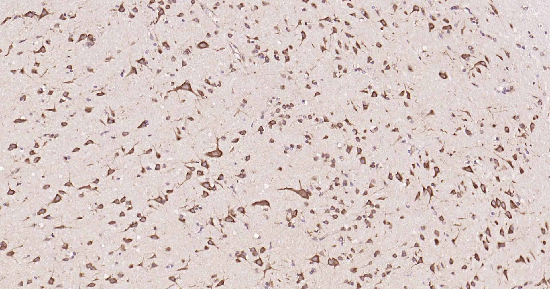 Paraformaldehyde-fixed, paraffin embedded Rat Cerebrum; Antigen retrieval by boiling in sodium citrate buffer (pH6.0) for 15 min; Antibody incubation with DDIT3 Polyclonal Antibody, Unconjugated (bs-20669R) at 1:200 overnight at 4°C, followed by conjugation to the SP Kit (Rabbit, SP-0023) and DAB (C-0010) staining.