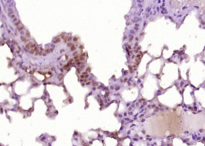 Paraformaldehyde-fixed, paraffin embedded (mouse lung tissue); Antigen retrieval by boiling in sodium citrate buffer (pH6.0) for 15min; Block endogenous peroxidase by 3% hydrogen peroxide for 20 minutes; Blocking buffer (normal goat serum) at 37°C for 30min; Antibody incubation with (SP140) Polyclonal Antibody, Unconjugated (bs-20853R) at 1:400 overnight at 4°C, followed by operating according to SP Kit(Rabbit) (sp-0023) instructionsand DAB staining.