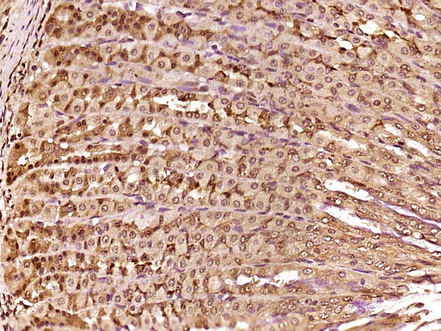 Paraformaldehyde-fixed, paraffin embedded (Rat stomach); Antigen retrieval by boiling in sodium citrate buffer (pH6.0) for 15min; Block endogenous peroxidase by 3% hydrogen peroxide for 20 minutes; Blocking buffer (normal goat serum) at 37°C for 30min; Antibody incubation with (HMGB1) Polyclonal Antibody, Unconjugated (bs-20633R) at 1:500 overnight at 4°C, followed by a conjugated secondary (sp-0023) for 20 minutes and DAB staining.
