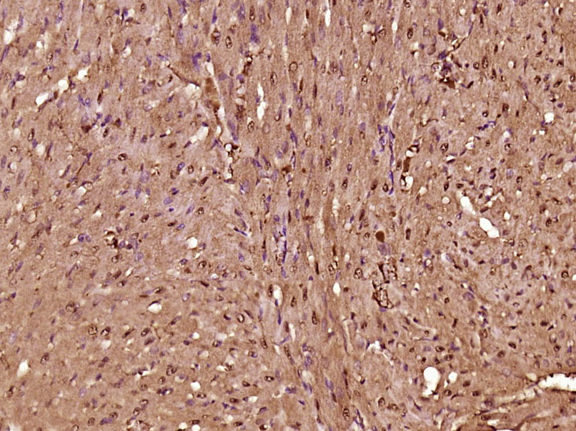 Paraformaldehyde-fixed, paraffin embedded (Rat heart); Antigen retrieval by boiling in sodium citrate buffer (pH6.0) for 15min; Block endogenous peroxidase by 3% hydrogen peroxide for 20 minutes; Blocking buffer (normal goat serum) at 37°C for 30min; Antibody incubation with (DNMT-3 alpha) Polyclonal Antibody, Unconjugated (bs-23029R) at 1:400 overnight at 4°C, followed by operating according to SP Kit(Rabbit) (sp-0023) instructionsand DAB staining.