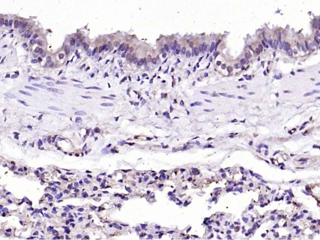 Paraformaldehyde-fixed, paraffin embedded (rat lung); Antigen retrieval by boiling in sodium citrate buffer (pH6.0) for 15min; Block endogenous peroxidase by 3% hydrogen peroxide for 20 minutes; Blocking buffer (normal goat serum) at 37°C for 30min; Antibody incubation with (Dnmt3a) Polyclonal Antibody, Unconjugated (bs-23029R) at 1:200 overnight at 4°C, followed by operating according to SP Kit(Rabbit) (sp-0023) instructionsand DAB staining.