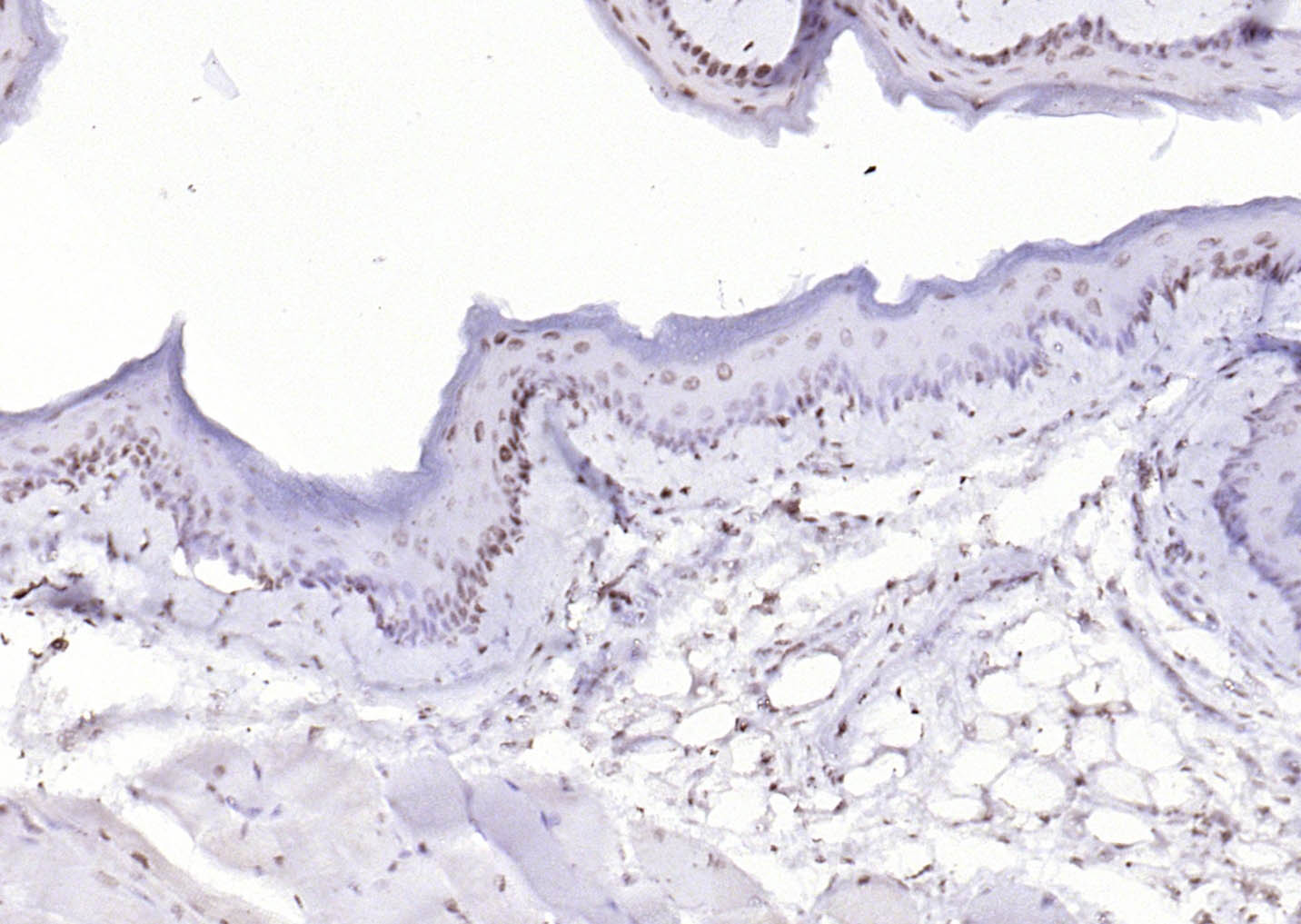 Paraformaldehyde-fixed, paraffin embedded (mouse esophageal); Antigen retrieval by boiling in sodium citrate buffer (pH6.0) for 15min; Block endogenous peroxidase by 3% hydrogen peroxide for 20 minutes; Blocking buffer (normal goat serum) at 37°C for 30min; Antibody incubation with (P53(Mono Methyl Lys370)) Monoclonal Antibody, Unconjugated (bsm-33209M) at 1:200 overnight at 4°C, followed by operating according to SP Kit(Mouse)(sp-0024) instructionsand DAB staining.
