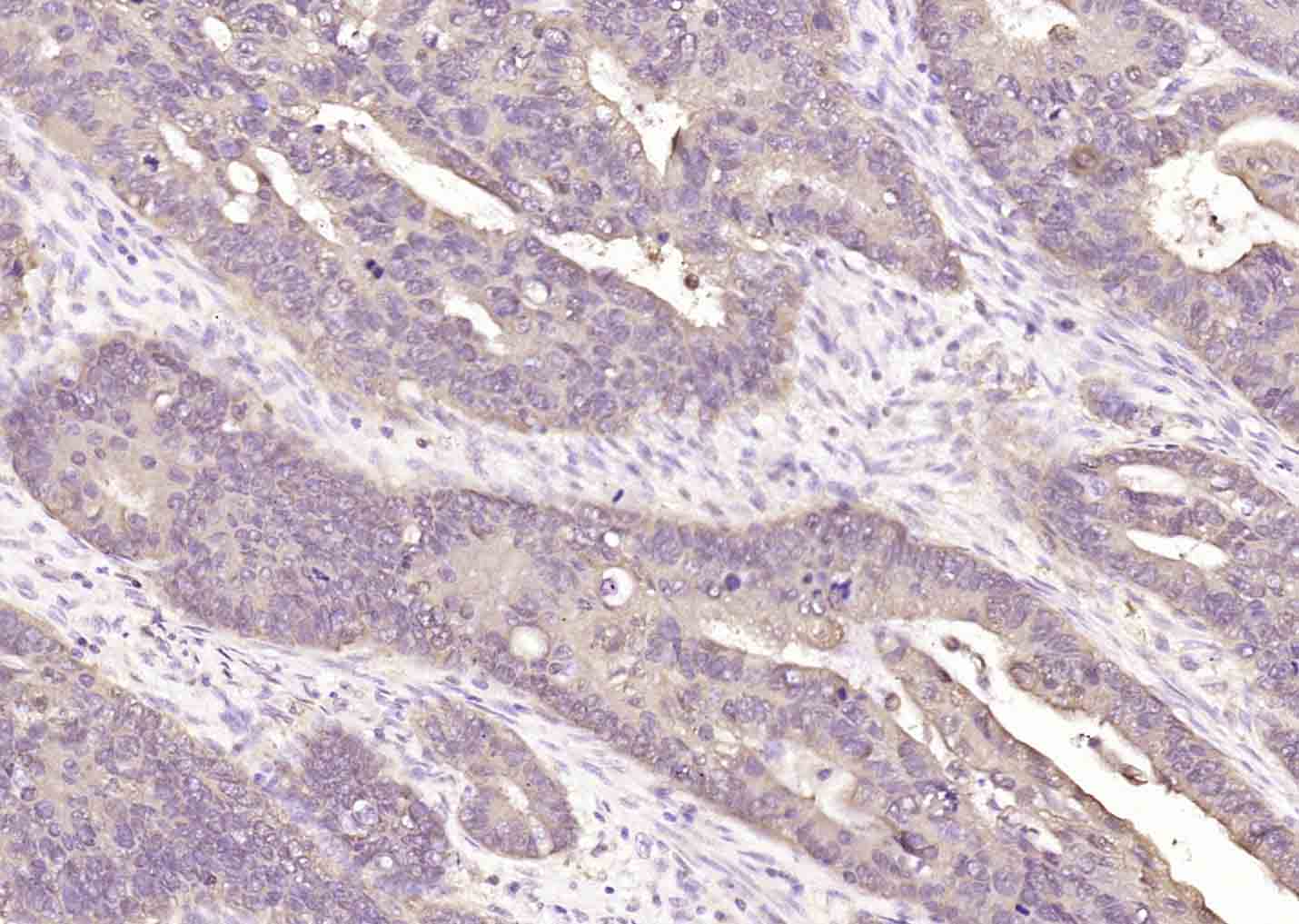 Paraformaldehyde-fixed, paraffin embedded (human colon carcinoma); Antigen retrieval by boiling in sodium citrate buffer (pH6.0) for 15min; Block endogenous peroxidase by 3% hydrogen peroxide for 20 minutes; Blocking buffer (normal goat serum) at 37°C for 30min; Antibody incubation with (Bcl-2) Monoclonal Antibody, Unconjugated (bsm-33047M) at 1:200 overnight at 4°C, followed by operating according to SP Kit(Mouse)(sp-0024) instructionsand DAB staining.