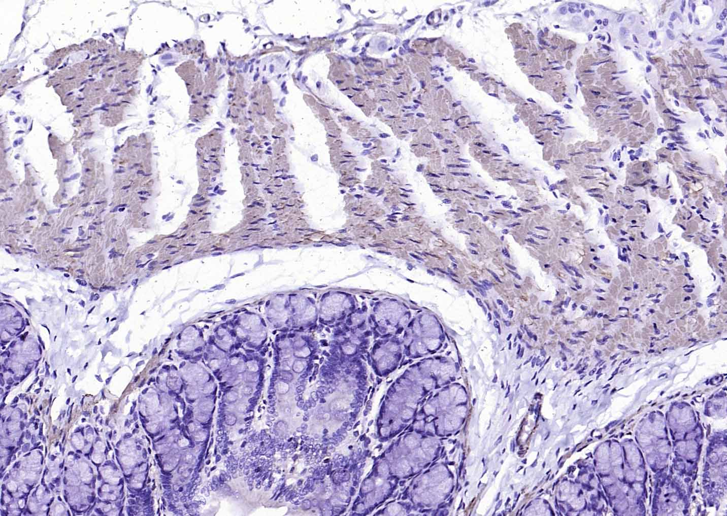 Paraformaldehyde-fixed, paraffin embedded Mouse Stomach; Antigen retrieval by boiling in sodium citrate buffer (pH6.0) for 15 min; Antibody incubation with alpha smooth muscle Actin Monoclonal Antibody, Unconjugated(bsm-33188M) at 1:200 overnight at 4°C, followed by conjugation to the bs-40296G-HRP and DAB (C-0010) staining.