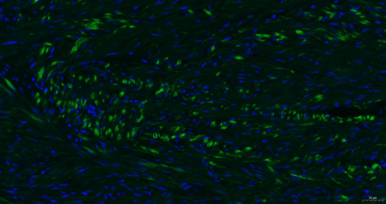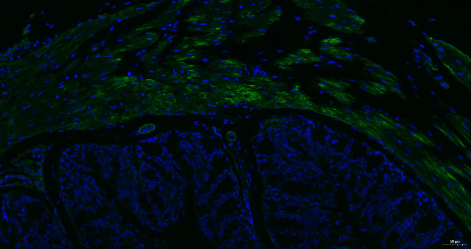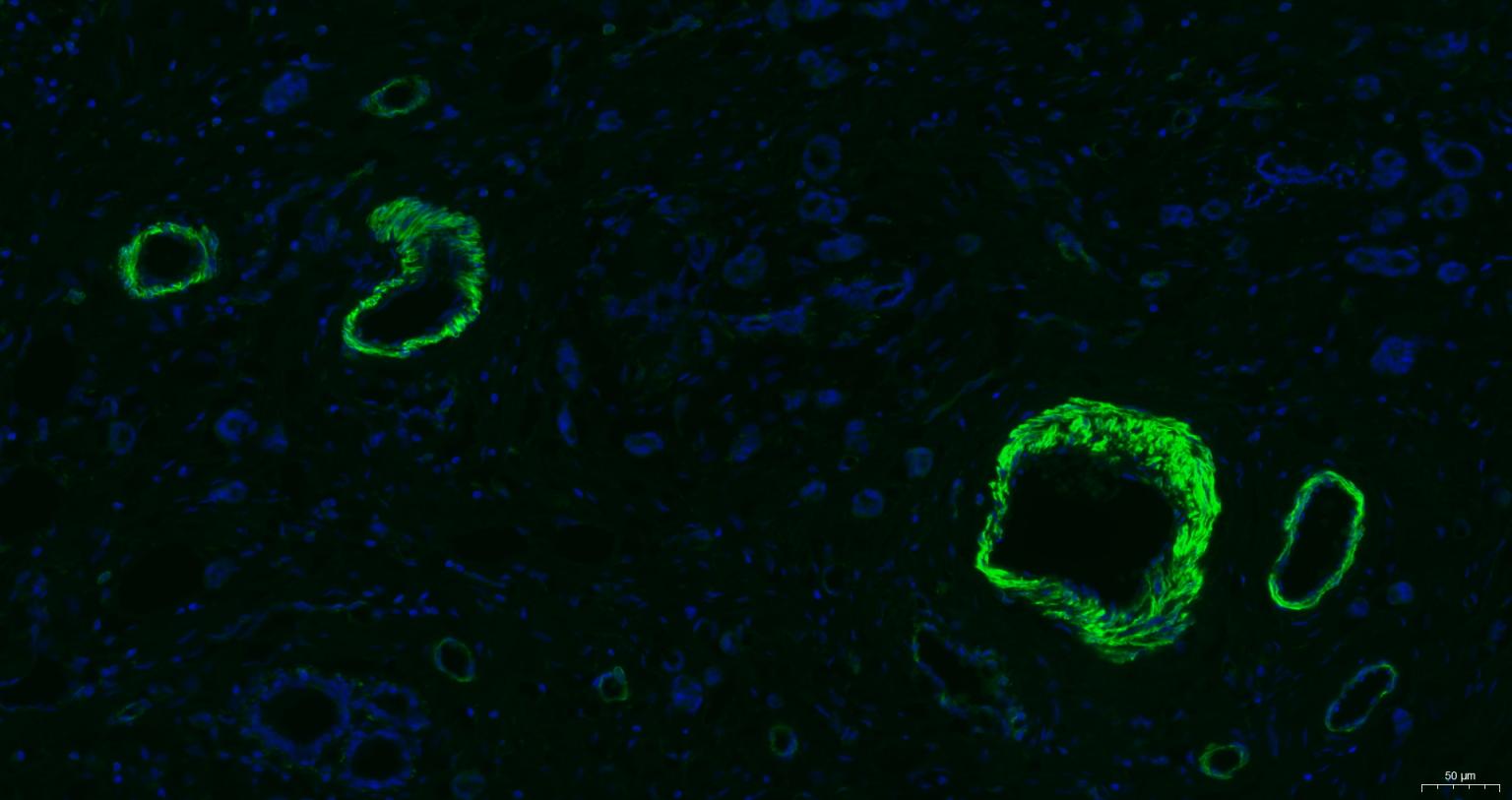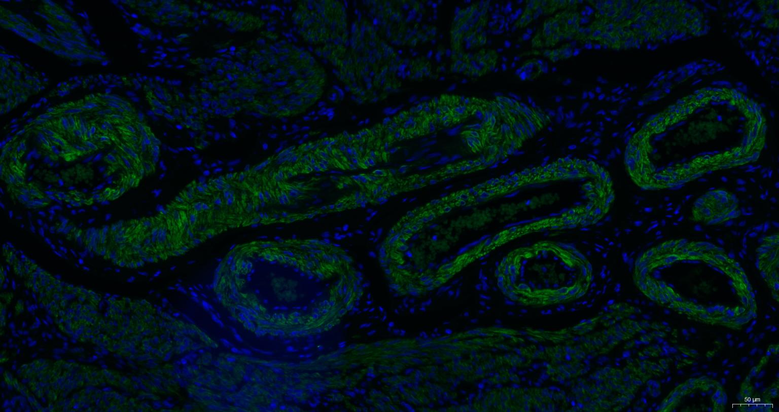 Paraformaldehyde-fixed, paraffin embedded Human Uterus; Antigen retrieval by boiling in sodium citrate buffer (pH6.0) for 15 min; Antibody incubation with alpha smooth muscle Actin Monoclonal Antibody, Unconjugated (bsm-33188M) at 1:200 overnight at 4°C. Followed by conjugated Goat Anti-Mouse IgG antibody (green, bs-0296G-BF488), DAPI (blue, C02-04002) was used to stain the cell nuclei.
