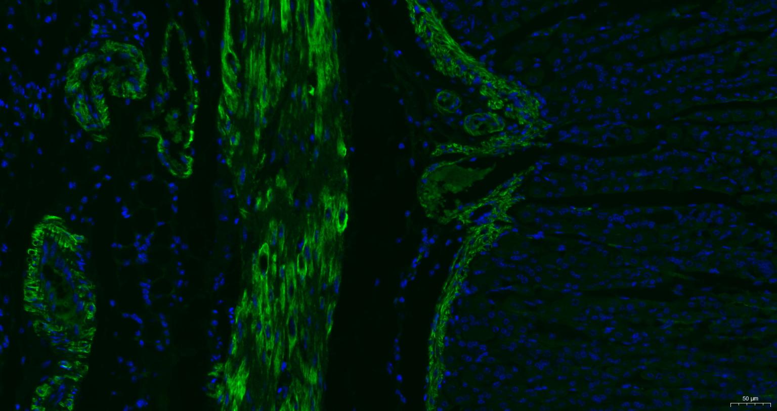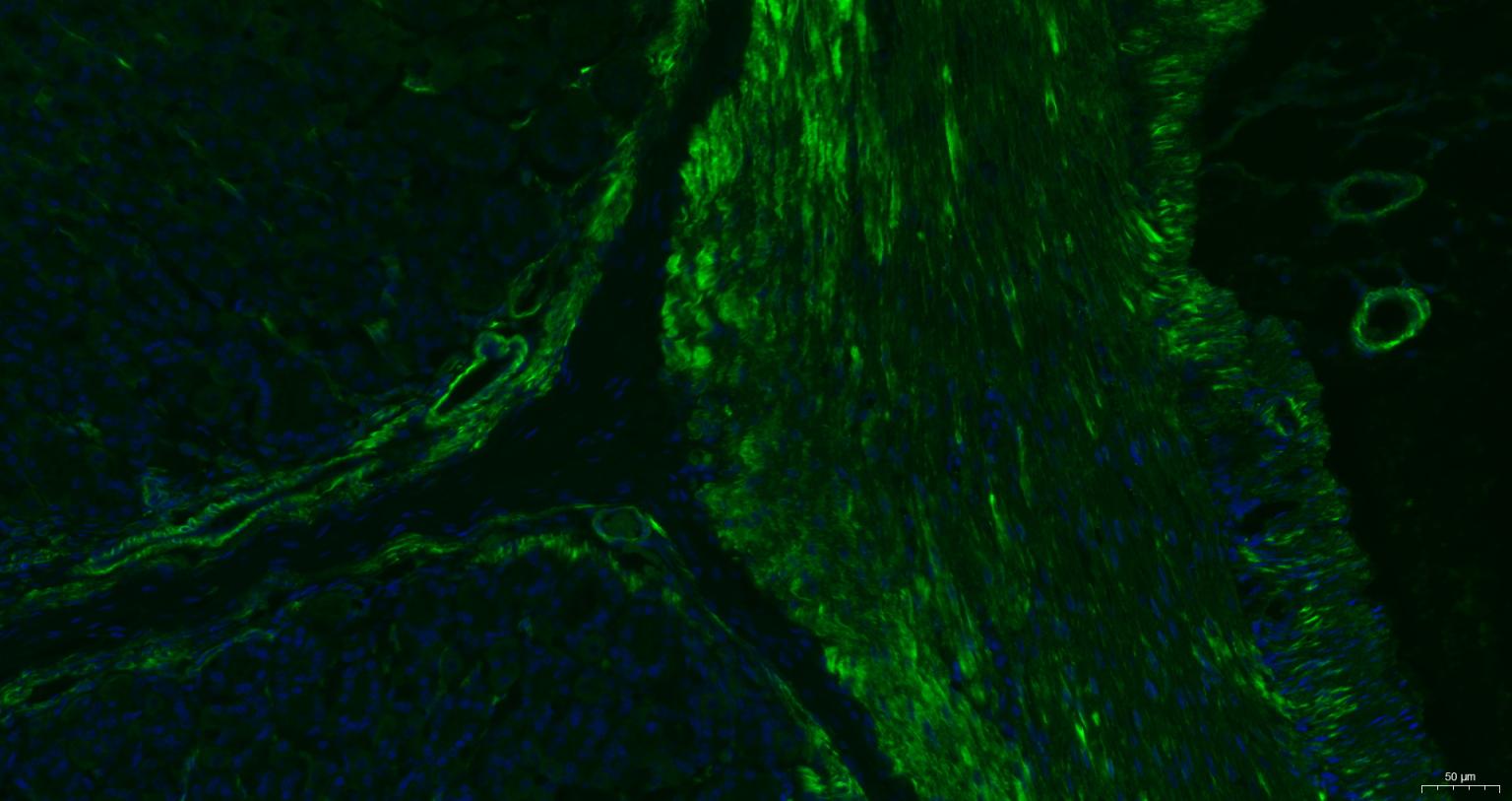 Paraformaldehyde-fixed, paraffin embedded Mouse Stomach; Antigen retrieval by boiling in sodium citrate buffer (pH6.0) for 15 min; Antibody incubation with alpha smooth muscle Actin Monoclonal Antibody, Unconjugated (bsm-33188M) at 1:200 overnight at 4°C. Followed by conjugated Goat Anti-Mouse IgG antibody (green, bs-0296G-BF488), DAPI (blue, C02-04002) was used to stain the cell nuclei.