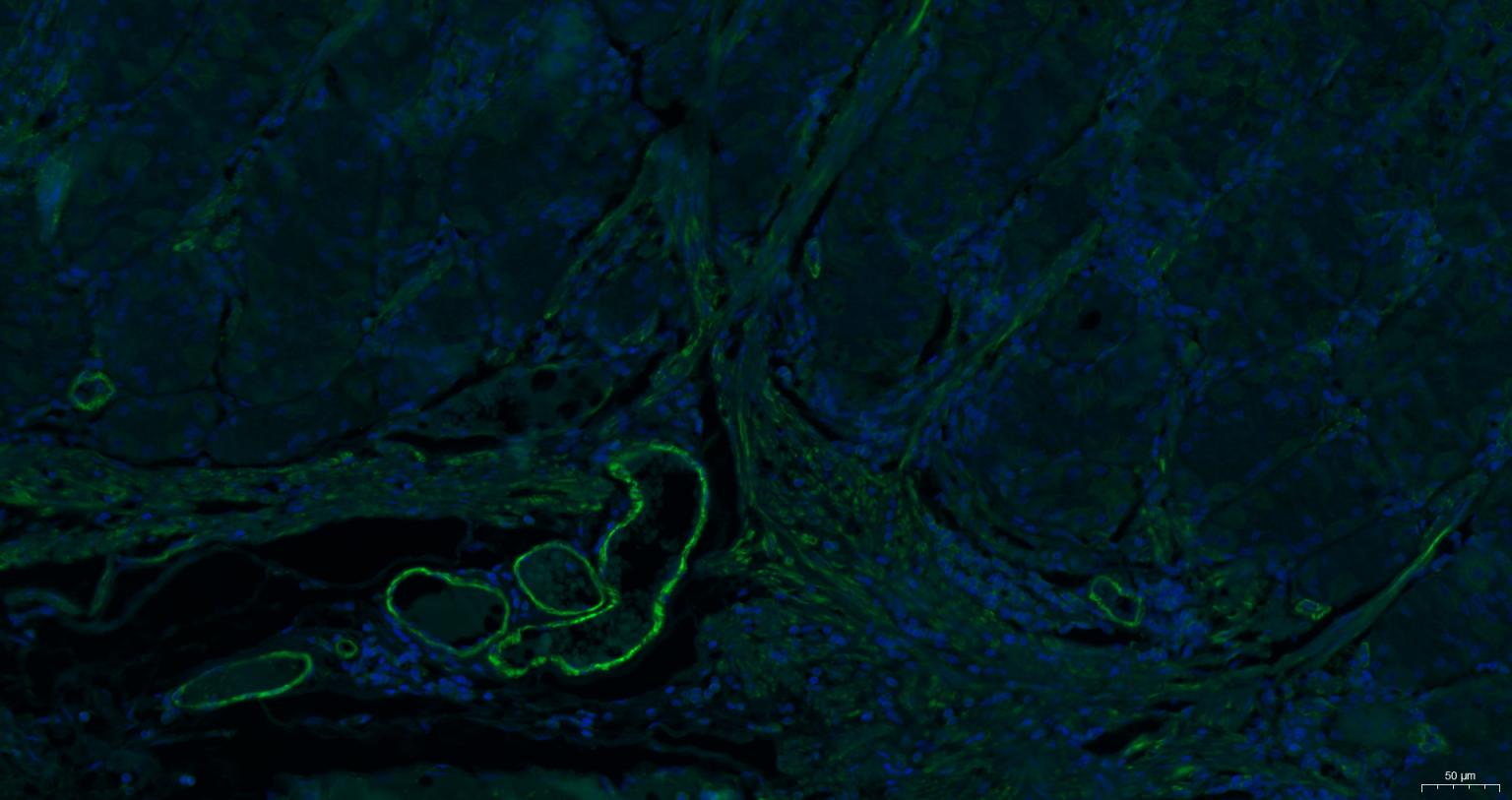 Paraformaldehyde-fixed, paraffin embedded Human Stomach; Antigen retrieval by boiling in sodium citrate buffer (pH6.0) for 15 min; Antibody incubation with alpha smooth muscle Actin Monoclonal Antibody, Unconjugated (bsm-33188M) at 1:200 overnight at 4°C. Followed by conjugated Goat Anti-Mouse IgG antibody (green, bs-0296G-BF488), DAPI (blue, C02-04002) was used to stain the cell nuclei.