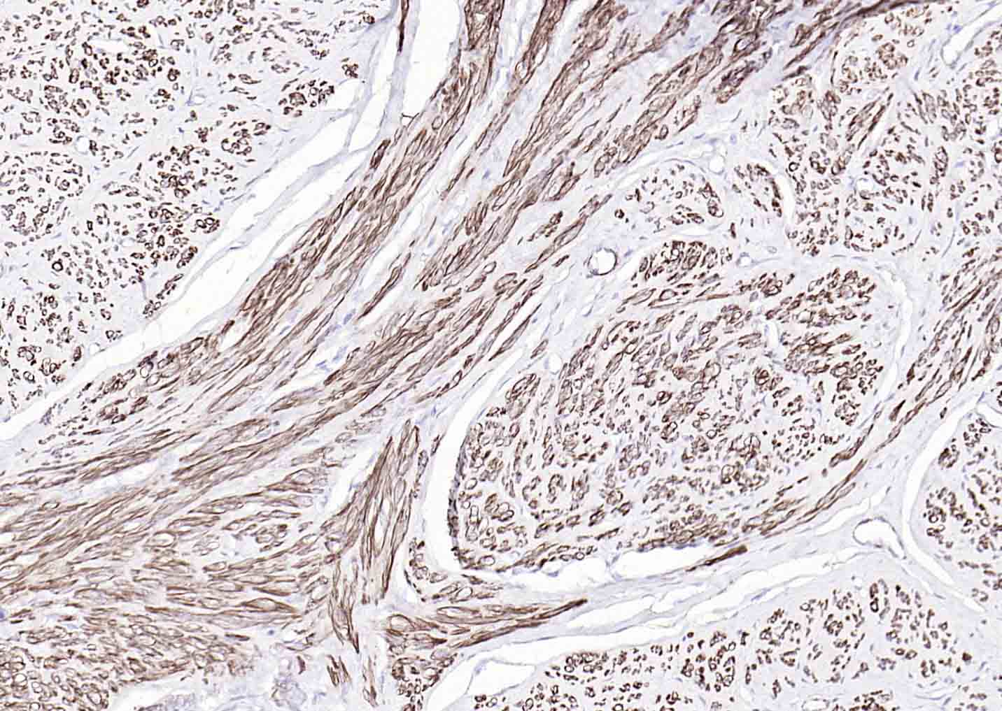 Paraformaldehyde-fixed, paraffin embedded Rat Stomach; Antigen retrieval by boiling in sodium citrate buffer (pH6.0) for 15 min; Antibody incubation with alpha smooth muscle Actin Monoclonal Antibody, Unconjugated(bsm-33188M) at 1:200 overnight at 4°C, followed by conjugation to the bs-40296G-HRP and DAB (C-0010) staining.