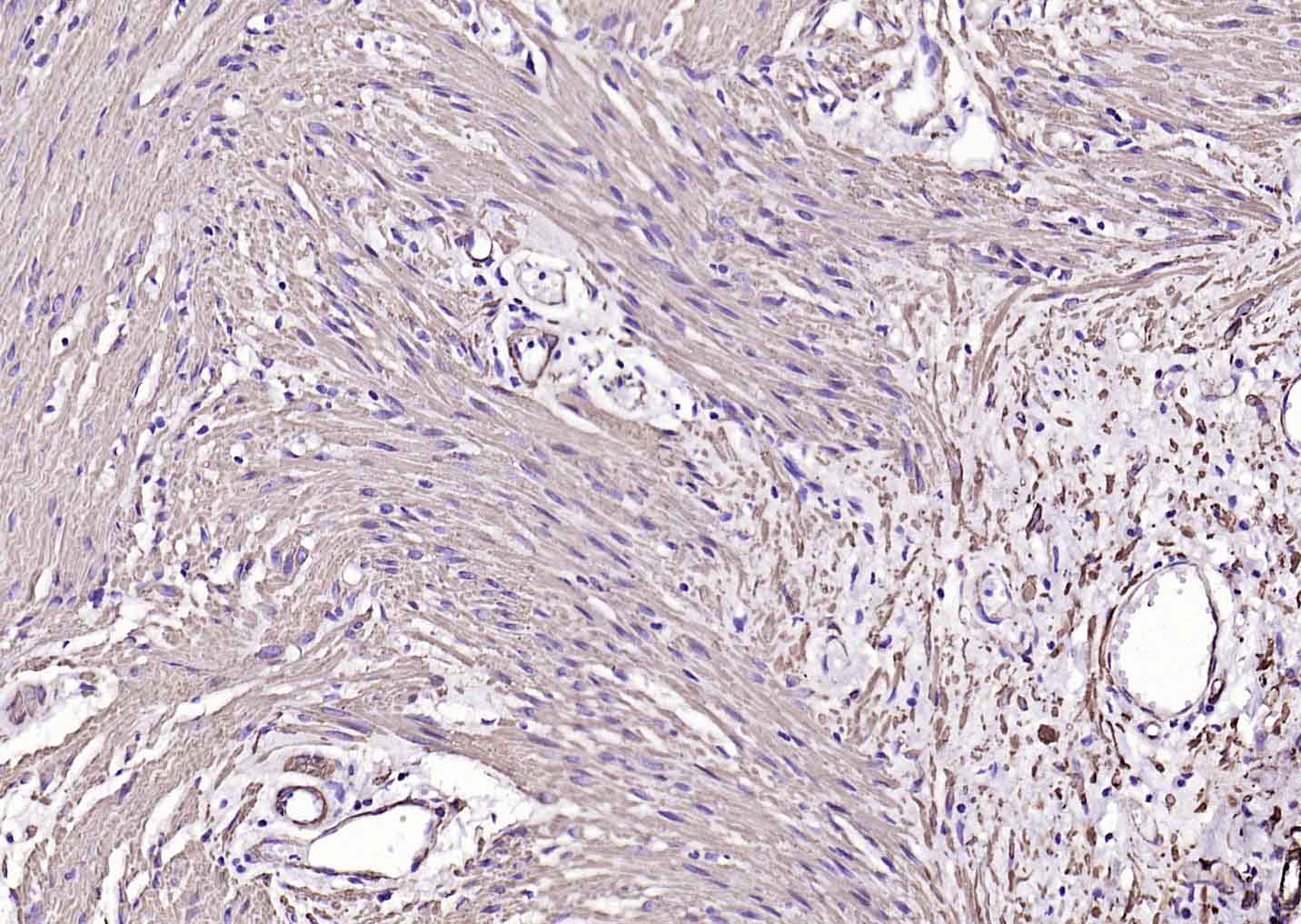 Paraformaldehyde-fixed, paraffin embedded Rat Uterus; Antigen retrieval by boiling in sodium citrate buffer (pH6.0) for 15 min; Antibody incubation with alpha smooth muscle Actin Monoclonal Antibody, Unconjugated(bsm-33188M) at 1:200 overnight at 4°C, followed by conjugation to the bs-40296G-HRP and DAB (C-0010) staining.