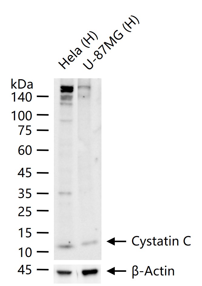 25 ug total protein per lane of various lysates (see on figure) probed with Cystatin C monoclonal antibody, unconjugated (bsm-33286M) at 1:1000 dilution and 4°C overnight incubation. Followed by conjugated secondary antibody incubation at r.t. for 60 min.