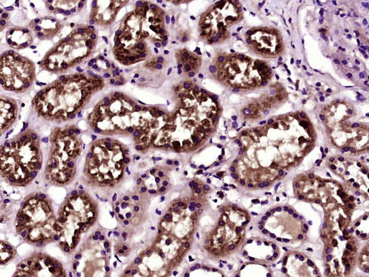 Paraformaldehyde-fixed, paraffin embedded (Human kidney tissue); Antigen retrieval by boiling in sodium citrate buffer (pH6.0) for 15min; Block endogenous peroxidase by 3% hydrogen peroxide for 20 minutes; Blocking buffer (normal goat serum) at 37°C for 30min; Antibody incubation with (Cystatin C) Monoclonal Antibody, Unconjugated (bsm-33286M) at 1:400 overnight at 4°C, followed by operating according to SP Kit(Mouse)(sp-0024) instructionsand DAB staining.