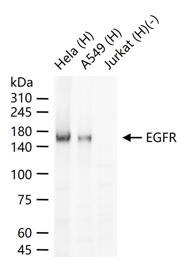 25 ug total protein per lane of various lysates (see on figure) probed with EGFR monoclonal antibody, unconjugated (bsm-33050M) at 1:1000 dilution and 4°C overnight incubation. Followed by conjugated secondary antibody incubation at r.t. for 60 min.