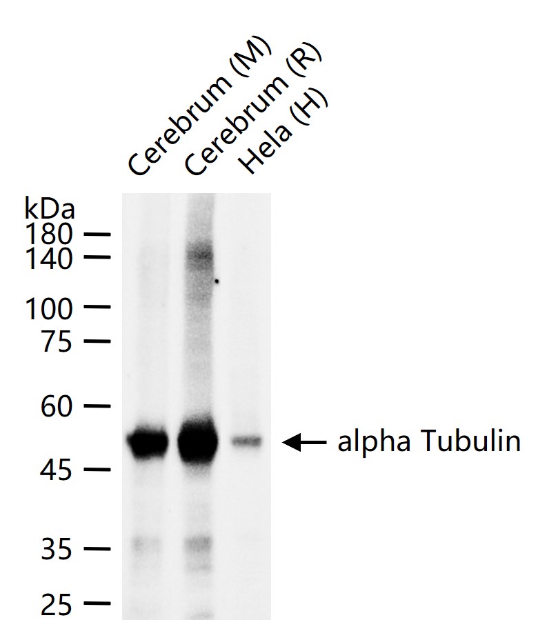 25 ug total protein per lane of various lysates (see on figure) probed with alpha Tubulin monoclonal antibody, unconjugated (bsm-33235M) at 1:2000 dilution and 4°C overnight incubation. Followed by conjugated secondary antibody incubation at r.t. for 60 min.