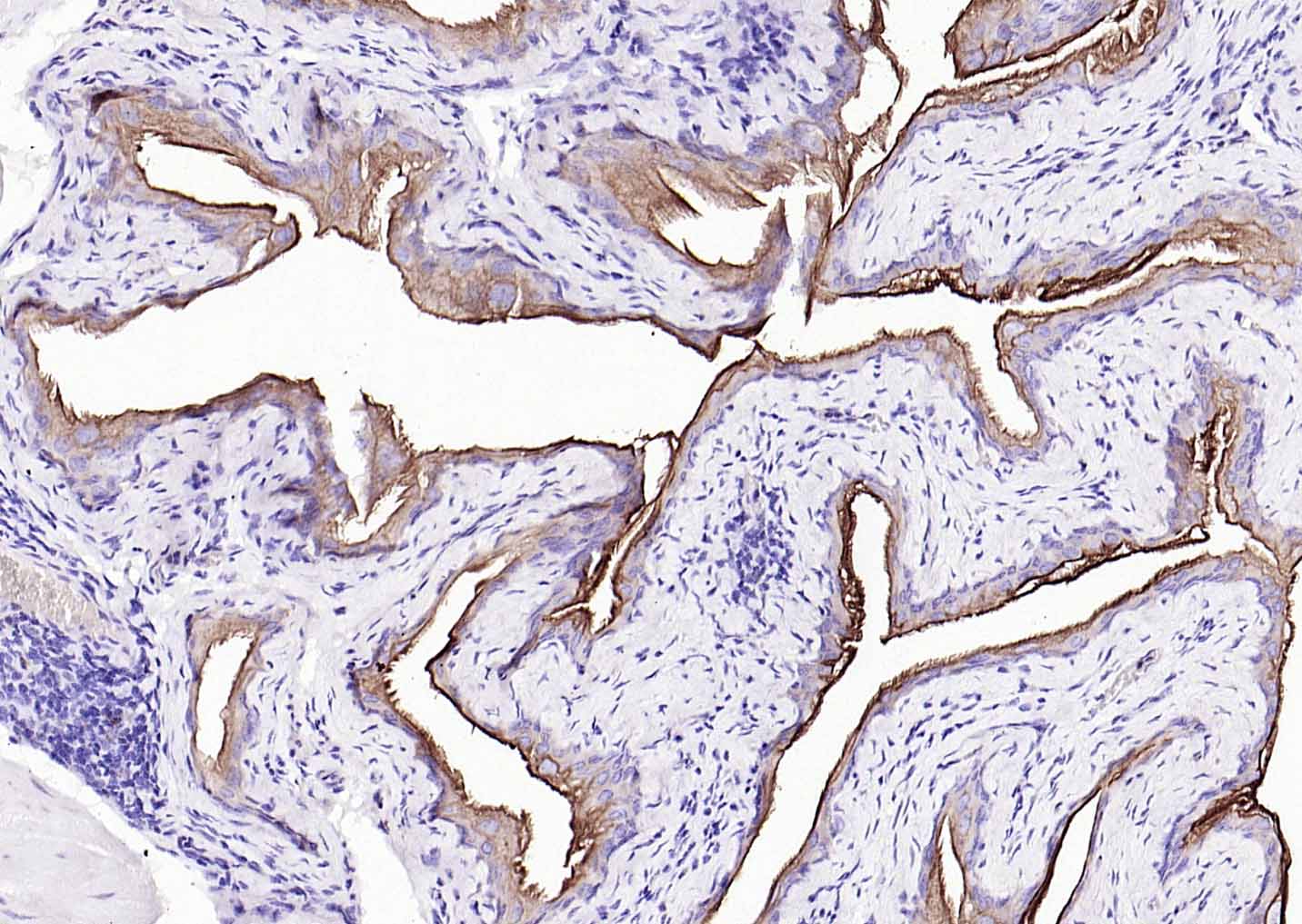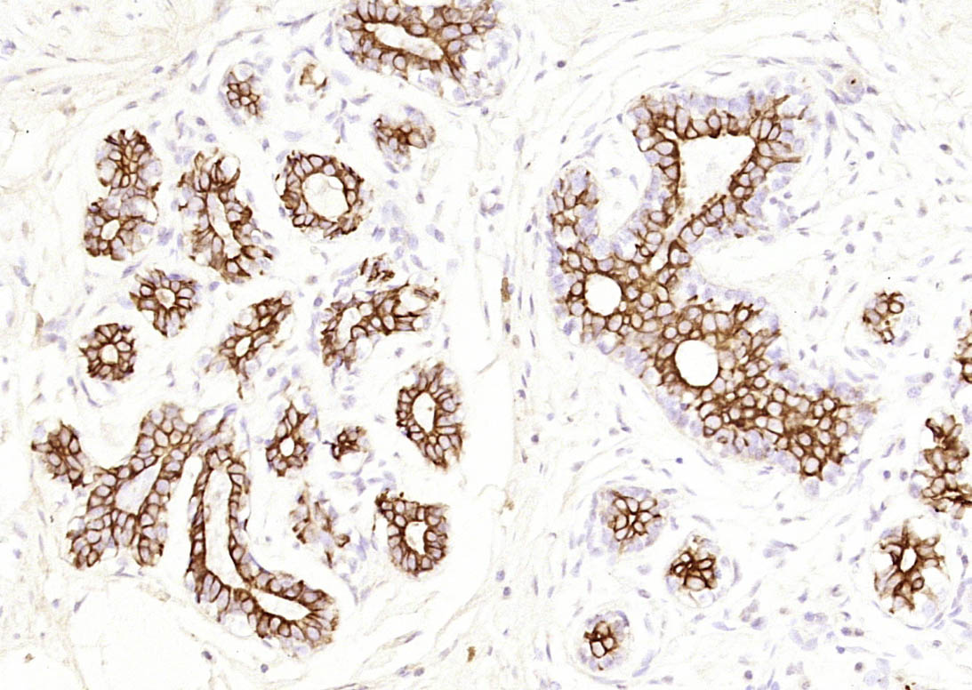 Paraformaldehyde-fixed, paraffin embedded (human breast); Antigen retrieval by boiling in sodium citrate buffer (pH6.0) for 15min; Block endogenous peroxidase by 3% hydrogen peroxide for 20 minutes; Blocking buffer (normal goat serum) at 37°C for 30min; Antibody incubation with (CK7) Monoclonal Antibody, Unconjugated (bsm-33060M) at 1:200 overnight at 4°C, followed by operating according to SP Kit(Mouse)(sp-0024) instructionsand DAB staining.