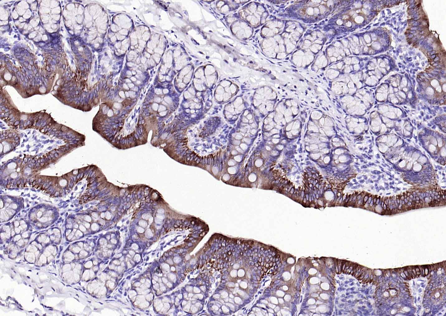 Paraformaldehyde-fixed, paraffin embedded (rat colon); Antigen retrieval by boiling in sodium citrate buffer (pH6.0) for 15min; Block endogenous peroxidase by 3% hydrogen peroxide for 20 minutes; Blocking buffer (normal goat serum) at 37°C for 30min; Antibody incubation with (CK7) Monoclonal Antibody, Unconjugated (bsm-33060M) at 1:200 overnight at 4°C, followed by operating according to SP Kit(Mouse)(sp-0024) instructionsand DAB staining.