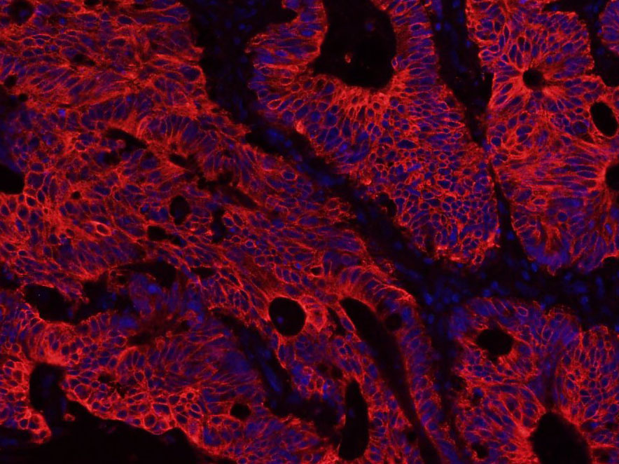 Paraformaldehyde-fixed, paraffin embedded (Human colon cancer); Antigen retrieval by boiling in sodium citrate buffer (pH6.0) for 15min; Block endogenous peroxidase by 3% hydrogen peroxide for 20 minutes; Blocking buffer (normal goat serum) at 37°C for 30min; Antibody incubation with (Cytokeratin 8) Monoclonal Antibody, Unconjugated (bsm-33061M) at 1:500 overnight at 4°C, followed by a conjugated Goat Anti-Mouse IgG antibody (bs-0296G-CY3) for 90 minutes, and DAPI for nuclei staining.