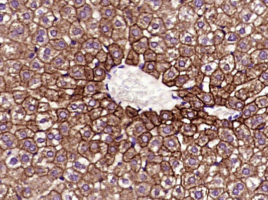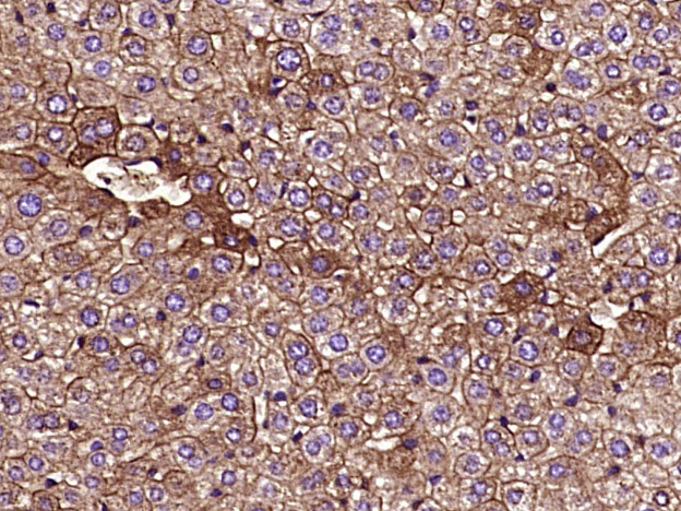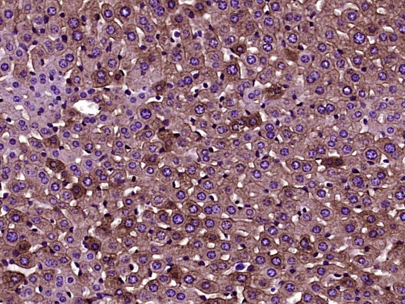 Paraformaldehyde-fixed, paraffin embedded (Mouse liver); Antigen retrieval by boiling in sodium citrate buffer (pH6.0) for 15min; Block endogenous peroxidase by 3% hydrogen peroxide for 20 minutes; Blocking buffer (normal goat serum) at 37°C for 30min; Antibody incubation with (Cytokeratin 8) Monoclonal Antibody, Unconjugated (ascites of bsm-33061M 10A8) at 1:2000 overnight at 4°C, followed by a conjugated secondary (sp-0024) for 20 minutes and DAB s