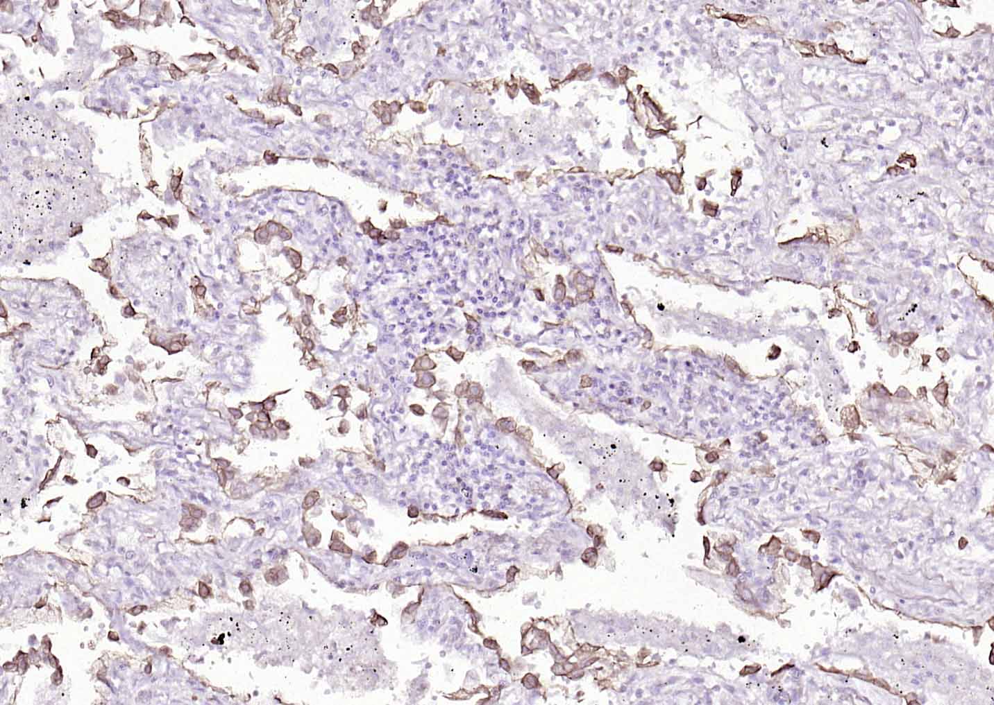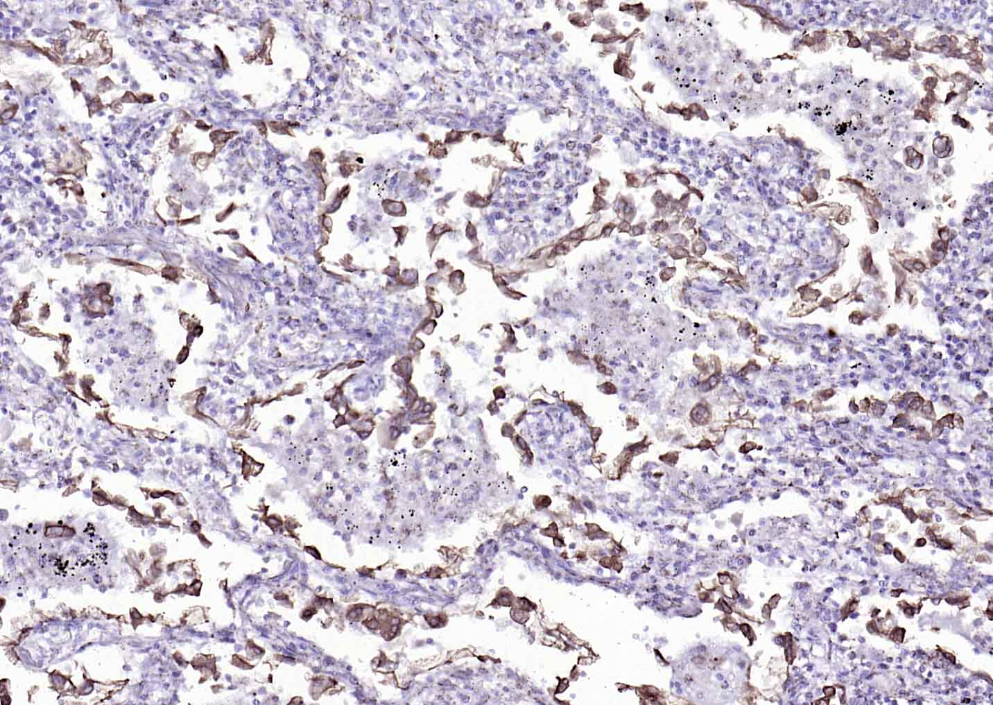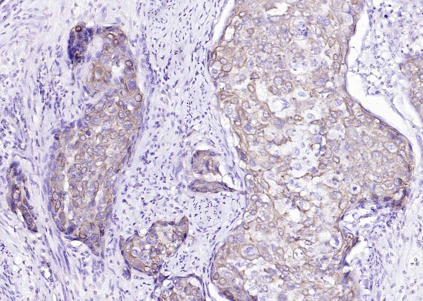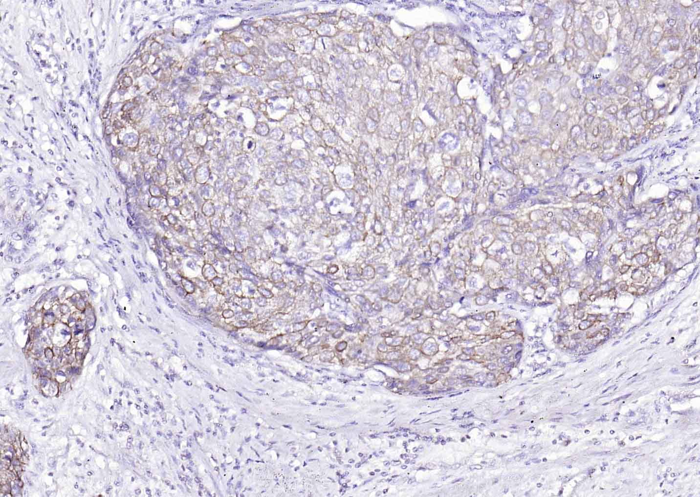 Paraformaldehyde-fixed, paraffin embedded (human lung carcinoma); Antigen retrieval by boiling in sodium citrate buffer (pH6.0) for 15min; Block endogenous peroxidase by 3% hydrogen peroxide for 20 minutes; Blocking buffer (normal goat serum) at 37°C for 30min; Antibody incubation with (Cytokeratin 8) Monoclonal Antibody, Unconjugated (bsm-33061M) at 1:200 overnight at 4°C, followed by operating according to SP Kit(Mouse)(sp-0024) instructionsand DAB staining.