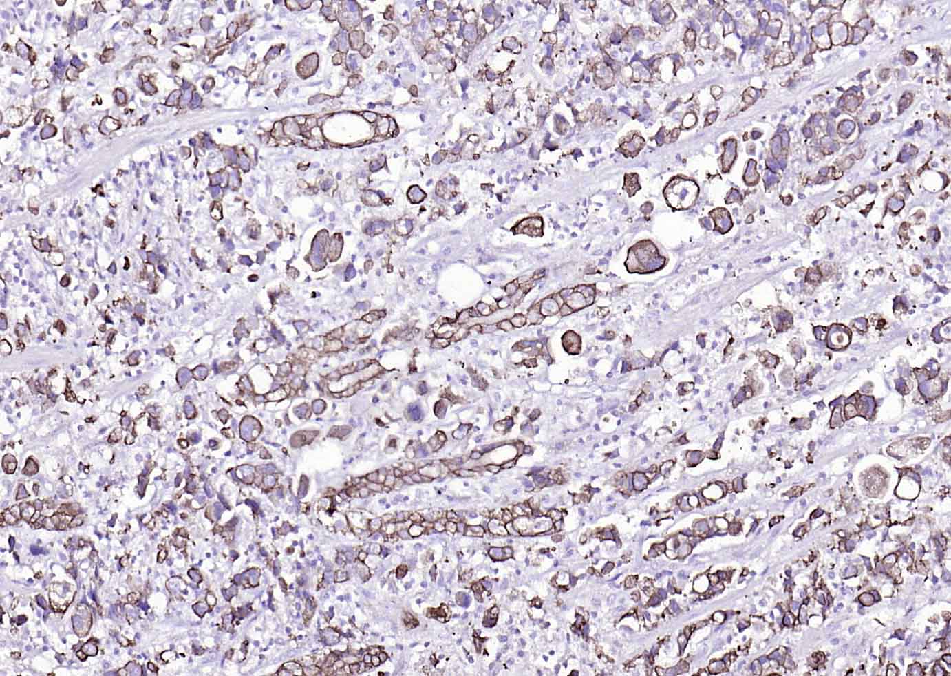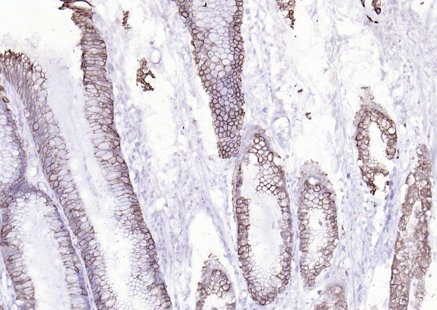 Paraformaldehyde-fixed, paraffin embedded (Human colon carcinoma); Antigen retrieval by boiling in sodium citrate buffer (pH6.0) for 15min; Block endogenous peroxidase by 3% hydrogen peroxide for 20 minutes; Blocking buffer (normal goat serum) at 37°C for 30min; Antibody incubation with (Cytokeratin 8) Monoclonal Antibody, Unconjugated (ascites of bsm-33061M 10A8) at 1:2000 overnight at 4°C, followed by a conjugated secondary (sp-0024) for 20 minutes and DAB staining.