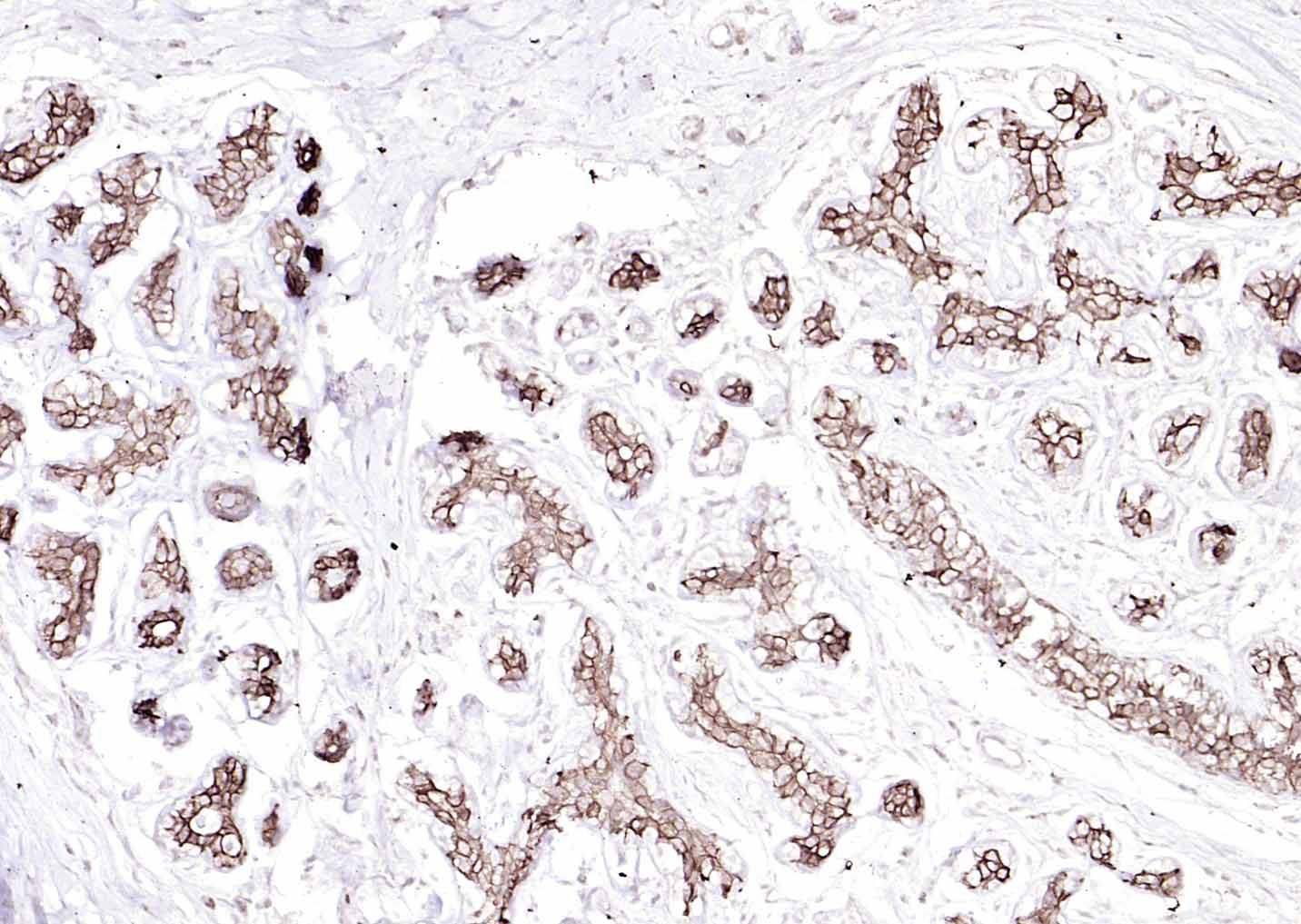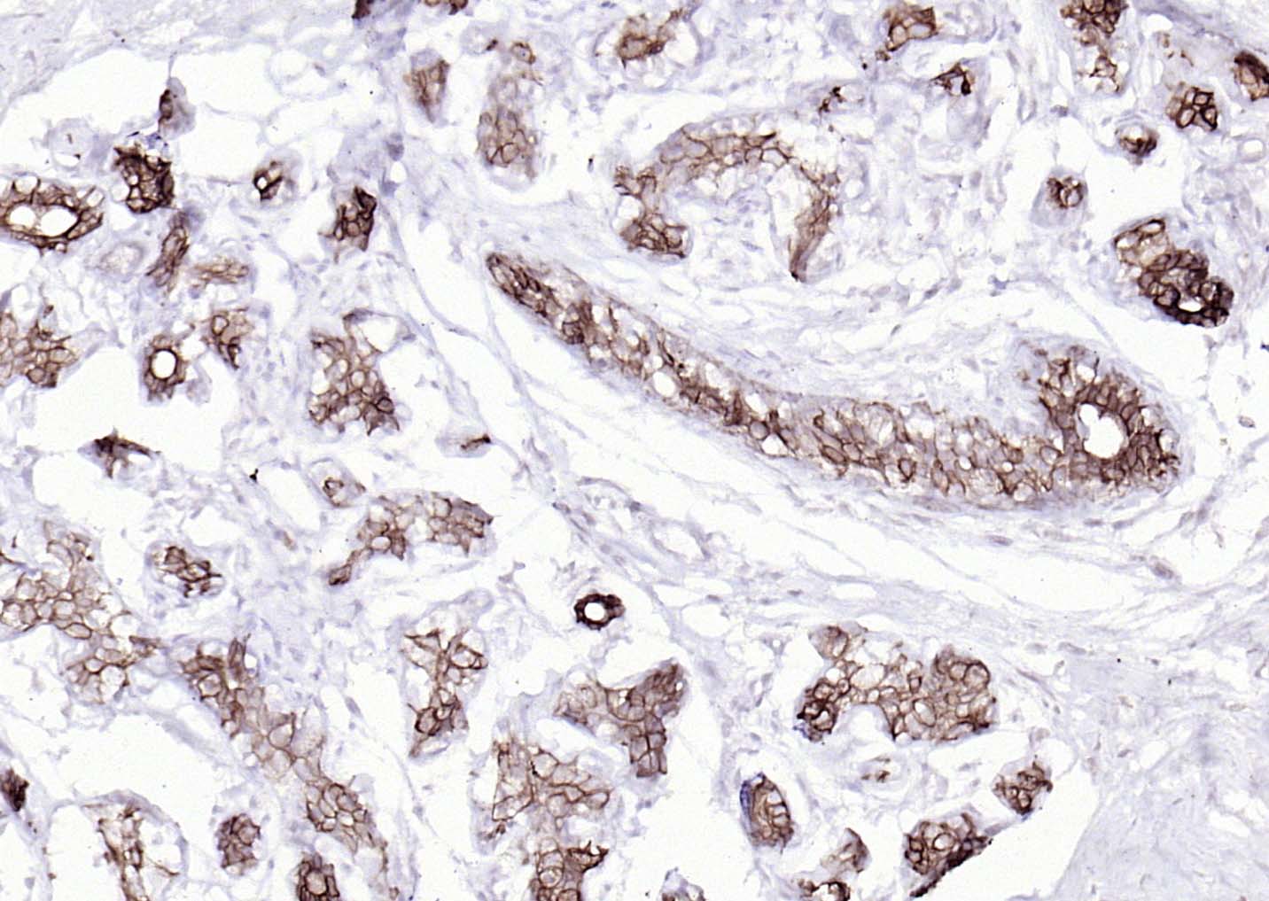 Paraformaldehyde-fixed, paraffin embedded (human breast carcinoma); Antigen retrieval by boiling in sodium citrate buffer (pH6.0) for 15min; Block endogenous peroxidase by 3% hydrogen peroxide for 20 minutes; Blocking buffer (normal goat serum) at 37°C for 30min; Antibody incubation with (Cytokeratin 8) Monoclonal Antibody, Unconjugated (bsm-33061M) at 1:200 overnight at 4°C, followed by operating according to SP Kit(Mouse)(sp-0024) instructionsand DAB staining.