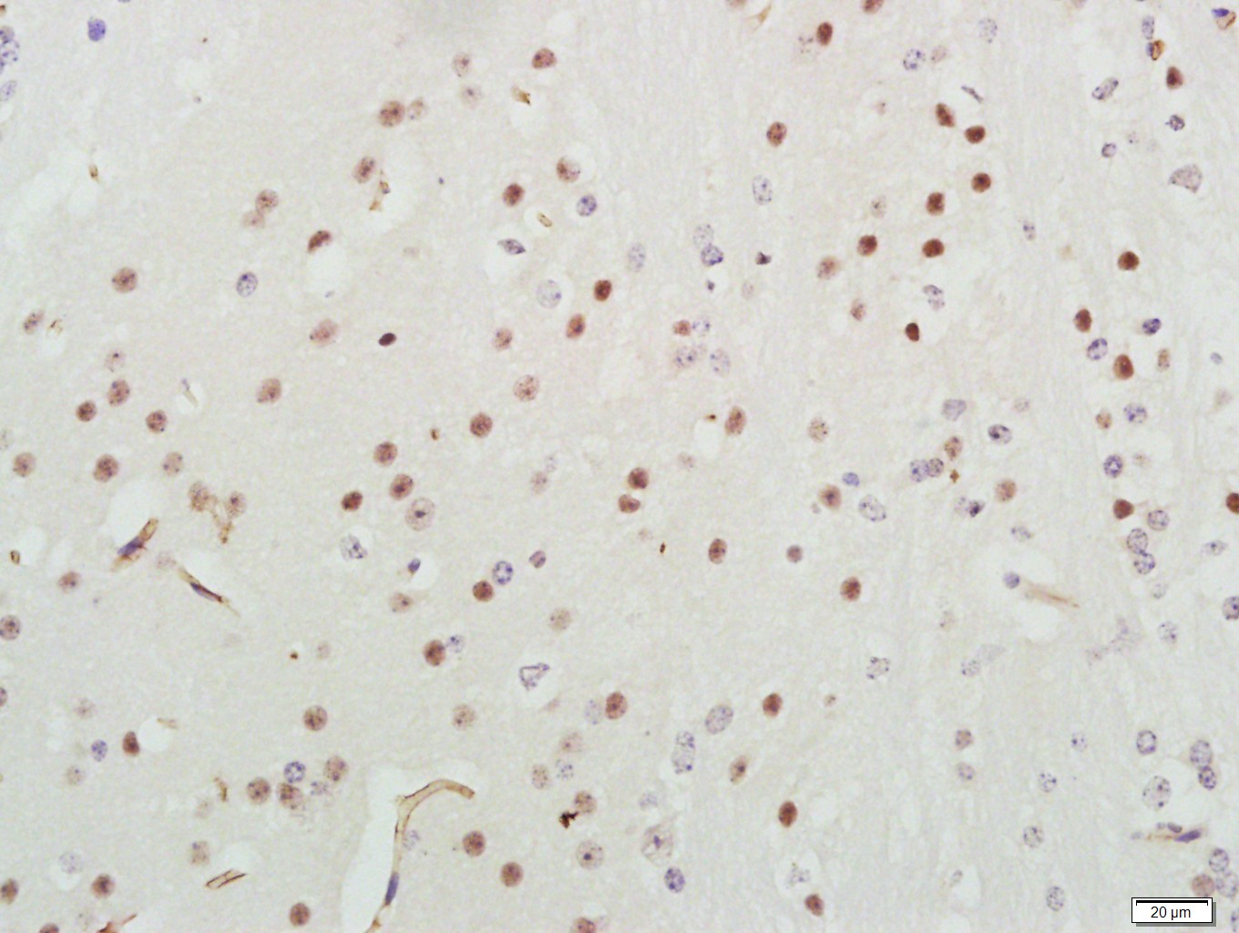 Paraformaldehyde-fixed, paraffin embedded (Mouse brain); Antigen retrieval by boiling in sodium citrate buffer (pH6.0) for 15min; Block endogenous peroxidase by 3% hydrogen peroxide for 20 minutes; Blocking buffer (normal goat serum) at 37°C for 30min; Antibody incubation with (PI3K p85) Monoclonal Antibody, Unconjugated (bsm-33219M) at 1:400 overnight at 4°C, followed by a conjugated secondary (sp-0023) for 20 minutes and DAB staining.