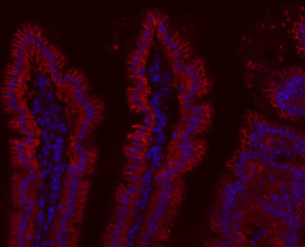 Paraformaldehyde-fixed, paraffin embedded (mouse intestine); Antigen retrieval by boiling in sodium citrate buffer (pH6.0) for 15min; Blocking buffer (normal goat serum) at 37°C for 30min; Incubation with (ATP1A1) Polyclonal Antibody, Unconjugated (bs-42166R) at 1:200 overnight at 4°C, followed by a conjugated Goat Anti-Rabbit IgG antibody (bs-0295G-BF594) for 90 minutes, and DAPI for nuclei staining.