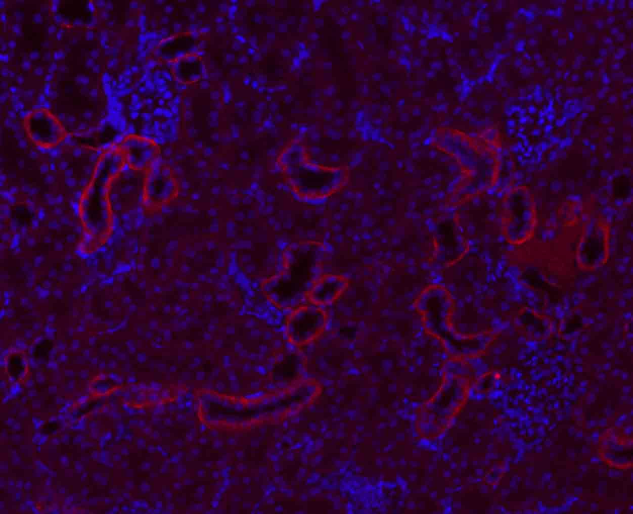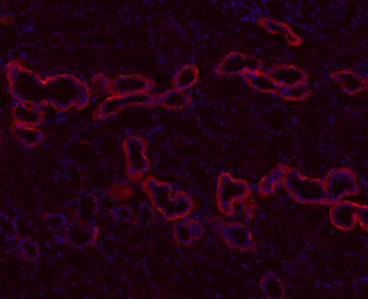 Paraformaldehyde-fixed, paraffin embedded (mouse kidney); Antigen retrieval by boiling in sodium citrate buffer (pH6.0) for 15min; Blocking buffer (normal goat serum) at 37°C for 30min; Incubation with (ATP1A1) Polyclonal Antibody, Unconjugated (bs-42166R) at 1:200 overnight at 4°C, followed by a conjugated Goat Anti-Rabbit IgG antibody (bs-0295G-BF594) for 90 minutes, and DAPI for nuclei staining.