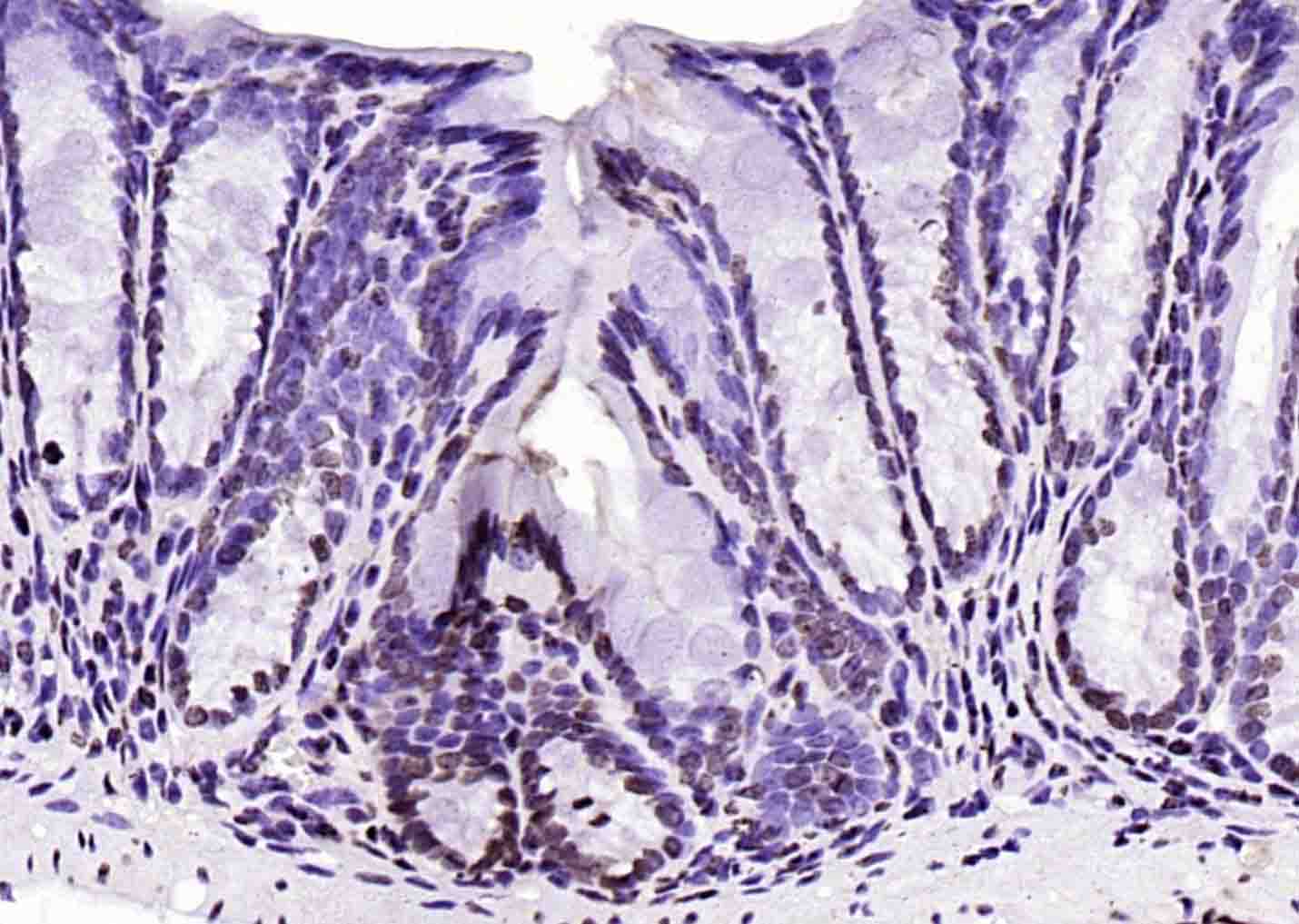 Paraformaldehyde-fixed, paraffin embedded (rat colon); Antigen retrieval by boiling in sodium citrate buffer (pH6.0) for 15min; Block endogenous peroxidase by 3% hydrogen peroxide for 20 minutes; Blocking buffer (normal goat serum) at 37°C for 30min; Antibody incubation with (Histone H3(di methyl K79)) Monoclonal Antibody, Unconjugated (ascites of bsm-33123M 6A6) at 1:2000 overnight at 4°C, followed by operating according to SP Kit(Mouse) (sp-0024) instructions and DAB staining.