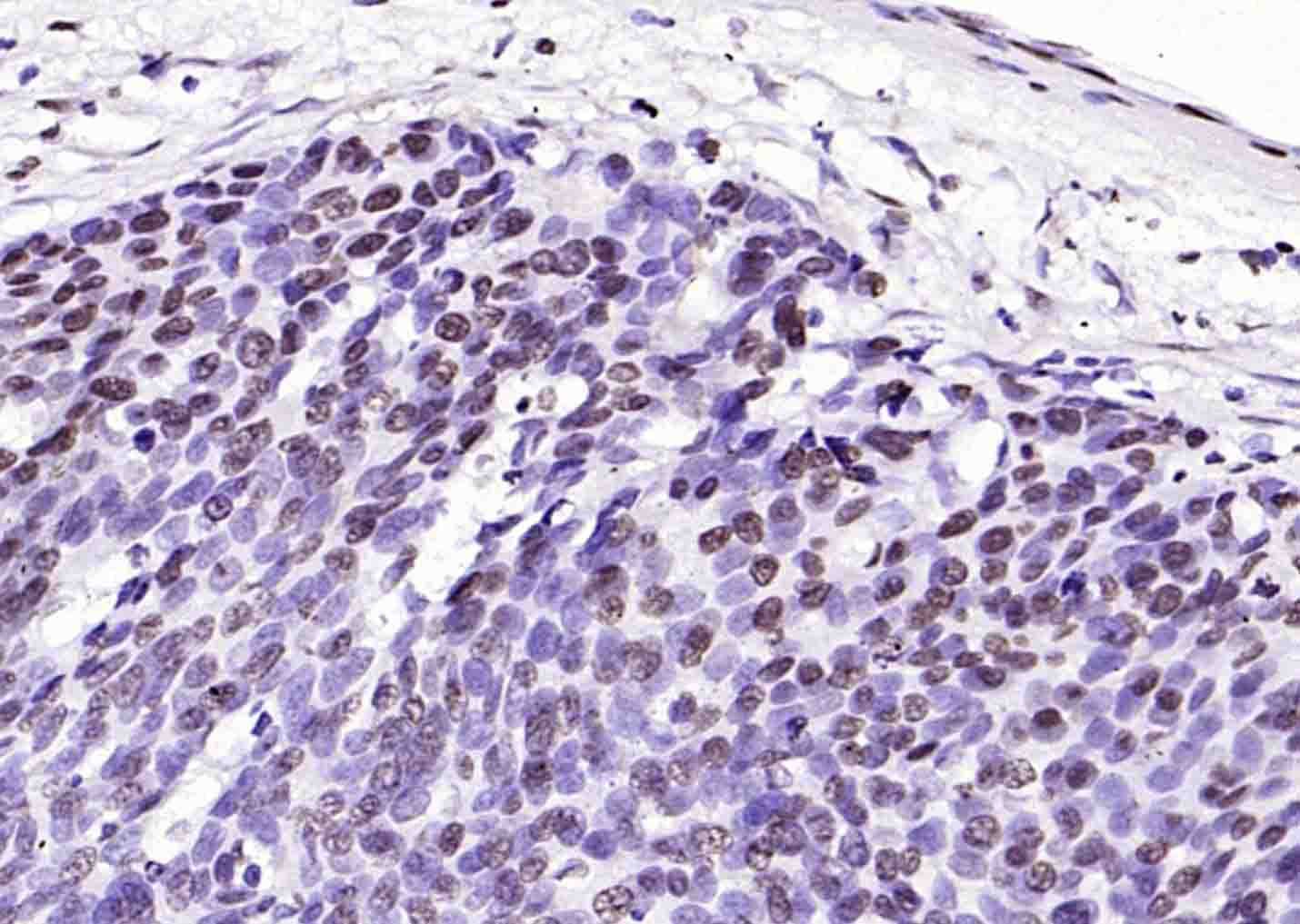 Paraformaldehyde-fixed, paraffin embedded (human laryngeal carcinoma); Antigen retrieval by boiling in sodium citrate buffer (pH6.0) for 15min; Block endogenous peroxidase by 3% hydrogen peroxide for 20 minutes; Blocking buffer (normal goat serum) at 37°C for 30min; Antibody incubation with (Histone H3(di methyl K79)) Monoclonal Antibody, Unconjugated (bsm-33123M) at 1:200 overnight at 4°C, followed by operating according to SP Kit(Mouse)(sp-0024) instructionsand DAB staining.