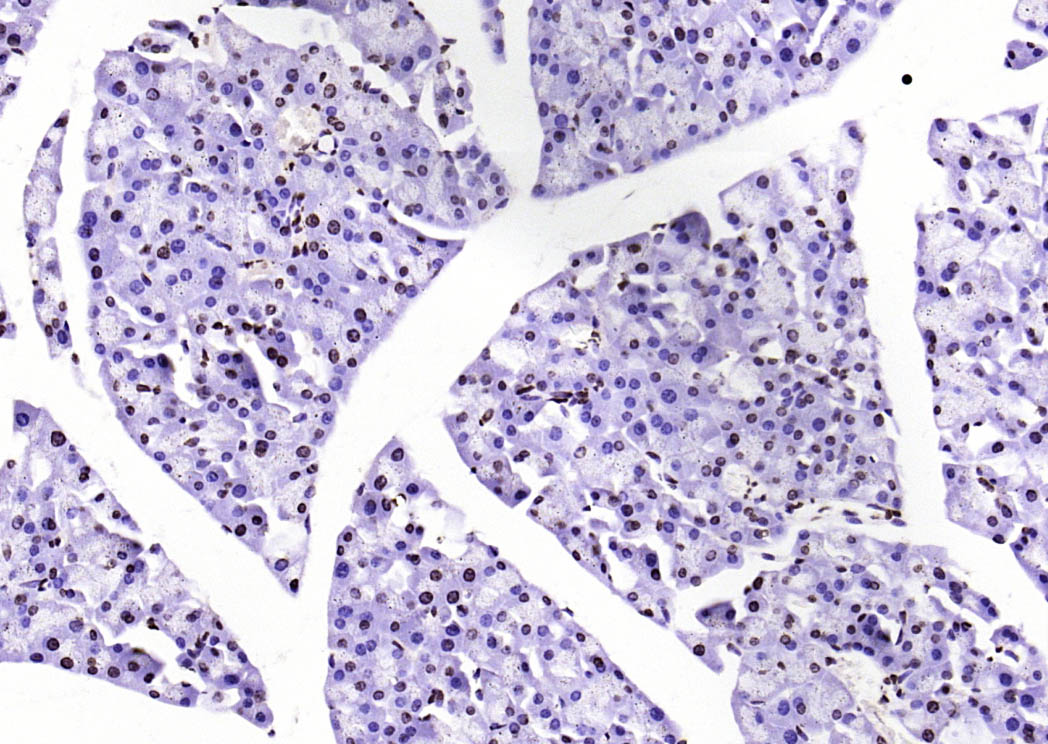 Paraformaldehyde-fixed, paraffin embedded (rat liver); Antigen retrieval by boiling in sodium citrate buffer (pH6.0) for 15min; Block endogenous peroxidase by 3% hydrogen peroxide for 20 minutes; Blocking buffer (normal goat serum) at 37°C for 30min; Antibody incubation with (Histone H3(di methyl K79)) Monoclonal Antibody, Unconjugated (ascites of bsm-33123M 6A6) at 1:2000 overnight at 4°C, followed by operating according to SP Kit(Mouse) (sp-0024) instructions and DAB staining.