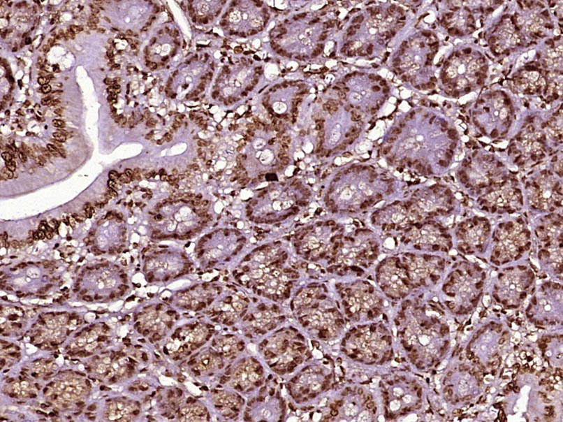 Paraformaldehyde-fixed, paraffin embedded (Rat colon); Antigen retrieval by boiling in sodium citrate buffer (pH6.0) for 15min; Block endogenous peroxidase by 3% hydrogen peroxide for 20 minutes; Blocking buffer (normal goat serum) at 37°C for 30min; Antibody incubation with (Histone H3(mono methyl K79)) Monoclonal Antibody, Unconjugated (bs-33104M 3D6) at 1:400 overnight at 4°C, followed by operating according to SP Kit(Mouse) (sp-0024) instructionsand DAB staining.