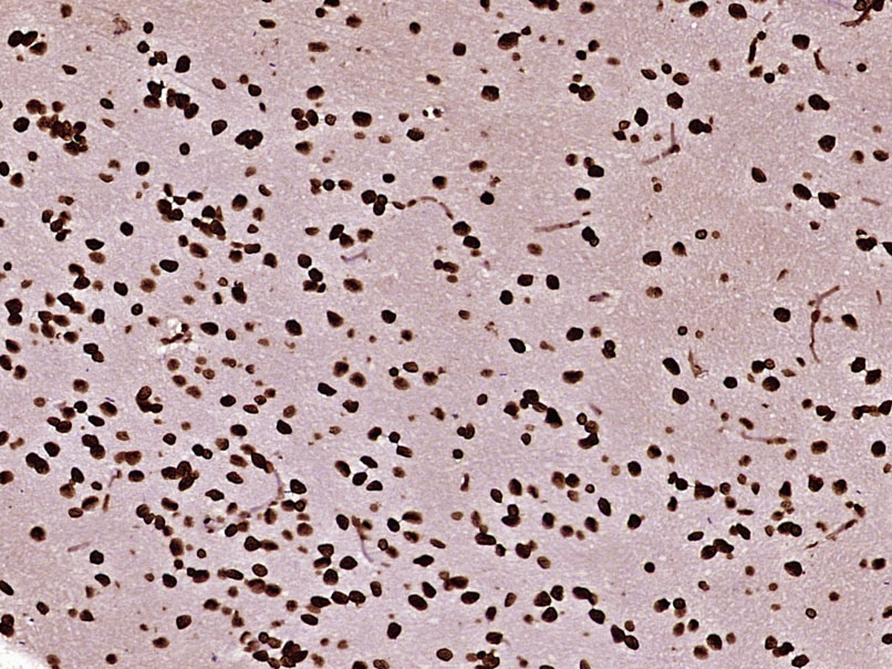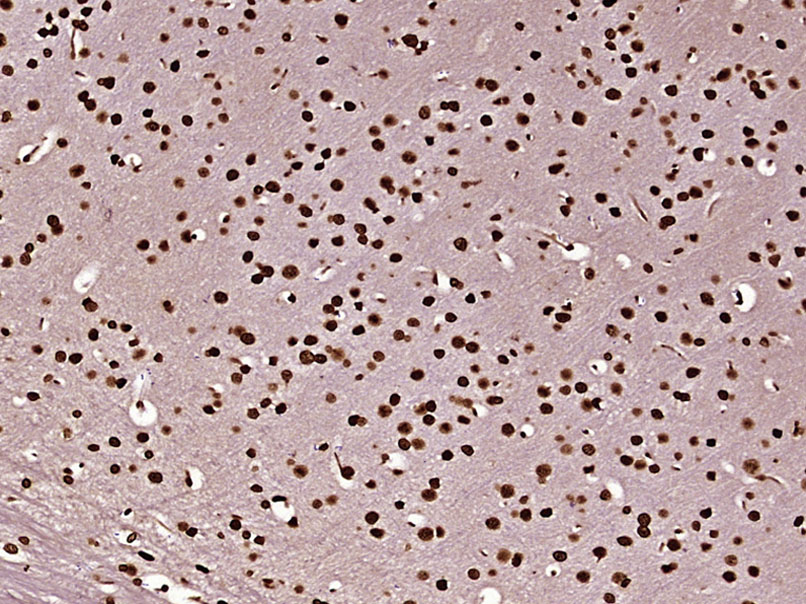 Paraformaldehyde-fixed, paraffin embedded (Rat brain); Antigen retrieval by boiling in sodium citrate buffer (pH6.0) for 15min; Block endogenous peroxidase by 3% hydrogen peroxide for 20 minutes; Blocking buffer (normal goat serum) at 37°C for 30min; Antibody incubation with (Histone H3(mono methyl K79)) Monoclonal Antibody, Unconjugated (bs-33104M 3D6) at 1:400 overnight at 4°C, followed by operating according to SP Kit(Mouse) (sp-0024) instructionsand DAB staining.