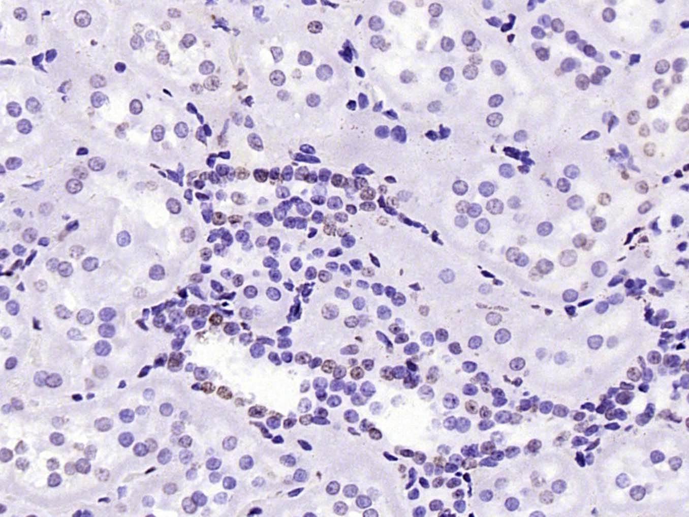Paraformaldehyde-fixed, paraffin embedded (rat kidney); Antigen retrieval by boiling in sodium citrate buffer (pH6.0) for 15min; Block endogenous peroxidase by 3% hydrogen peroxide for 20 minutes; Blocking buffer (normal goat serum) at 37°C for 30min; Antibody incubation with (Histone H3) Monoclonal Antibody, Unconjugated (ascites of bsm-33104M 3D6) at 1:2000 overnight at 4°C, followed by operating according to SP Kit(Mouse) (sp-0024) instructions and DAB staining.