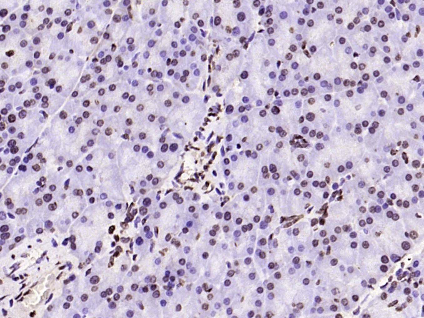 Paraformaldehyde-fixed, paraffin embedded (rat pancreas); Antigen retrieval by boiling in sodium citrate buffer (pH6.0) for 15min; Block endogenous peroxidase by 3% hydrogen peroxide for 20 minutes; Blocking buffer (normal goat serum) at 37°C for 30min; Antibody incubation with (Histone H3) Monoclonal Antibody, Unconjugated (ascites of bsm-33104M 3D6) at 1:2000 overnight at 4°C, followed by operating according to SP Kit(Mouse) (sp-0024) instructions and DAB staining.