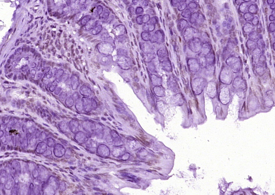Paraformaldehyde-fixed, paraffin embedded (mouse colon tissue); Antigen retrieval by boiling in sodium citrate buffer (pH6.0) for 15min; Block endogenous peroxidase by 3% hydrogen peroxide for 20 minutes; Blocking buffer (normal goat serum) at 37°C for 30min; Antibody incubation with (Histone H3 (mono methyl K9)) Monoclonal Antibody, Unconjugated (ascites of bsm-33116M) at 1:2000 overnight at 4°C, followed by a conjugated secondary (sp-0024) for 20 minutes and DAB staining.