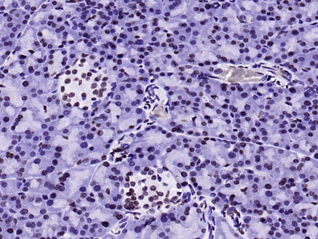 Paraformaldehyde-fixed, paraffin embedded (rat pancreas); Antigen retrieval by boiling in sodium citrate buffer (pH6.0) for 15min; Block endogenous peroxidase by 3% hydrogen peroxide for 20 minutes; Blocking buffer (normal goat serum) at 37°C for 30min; Antibody incubation with (Histone H3) Monoclonal Antibody, Unconjugated (ascites of bsm-33116M 3F8) at 1:2000 overnight at 4°C, followed by operating according to SP Kit(Mouse) (sp-0024) instructions and DAB staining.