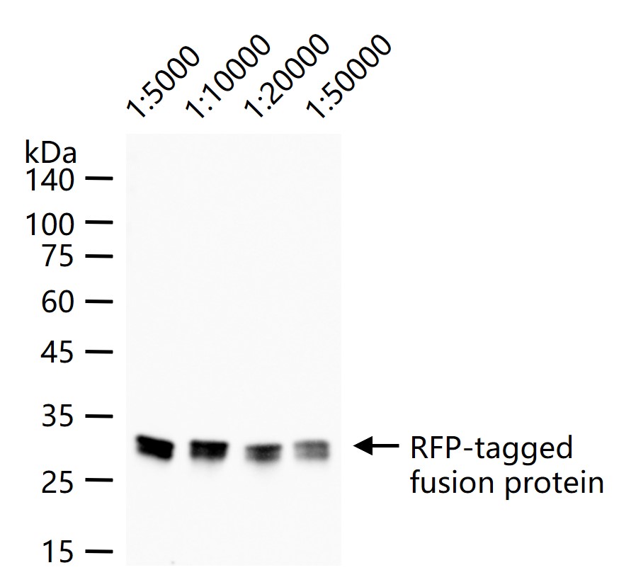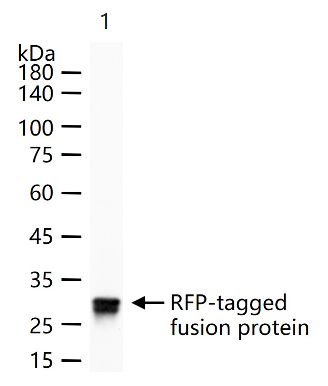 20 ng Recombinant RFP-His protein (bs-33011P) per lane probed with RFP monoclonal antibody respectively, unconjugated (bsm-33011M) at 1:5000-1:50000 dilution and 4°C overnight incubation. Followed by corresponding conjugated secondary antibody incubation at r.t. for 60 min.
