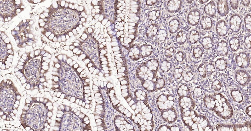 Paraformaldehyde-fixed, paraffin embedded Human Small Intestine; Antigen retrieval by boiling in sodium citrate buffer (pH6.0) for 15 min; Antibody incubation with Galectin 3 Monoclonal Antibody, Unconjugated (ascites of bsm-33248M) at 1:1000 overnight at 4°C, followed by conjugation to the SP Kit (Mouse, sp-0024) and DAB (C-0010) staining.