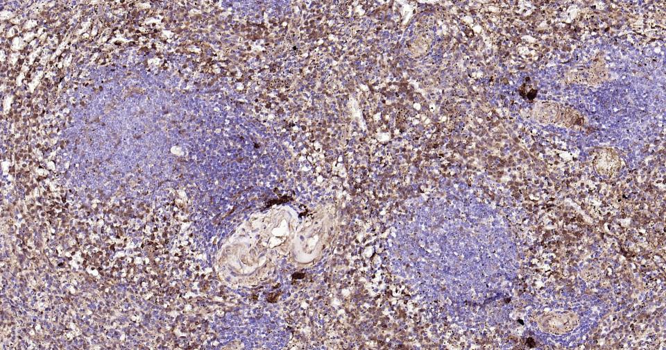 Paraformaldehyde-fixed, paraffin embedded Human Spleen; Antigen retrieval by boiling in sodium citrate buffer (pH6.0) for 15 min; Antibody incubation with Galectin 3 Monoclonal Antibody, Unconjugated (ascites of bsm-33248M) at 1:1000 overnight at 4°C, followed by conjugation to the SP Kit (Mouse, sp-0024) and DAB (C-0010) staining.