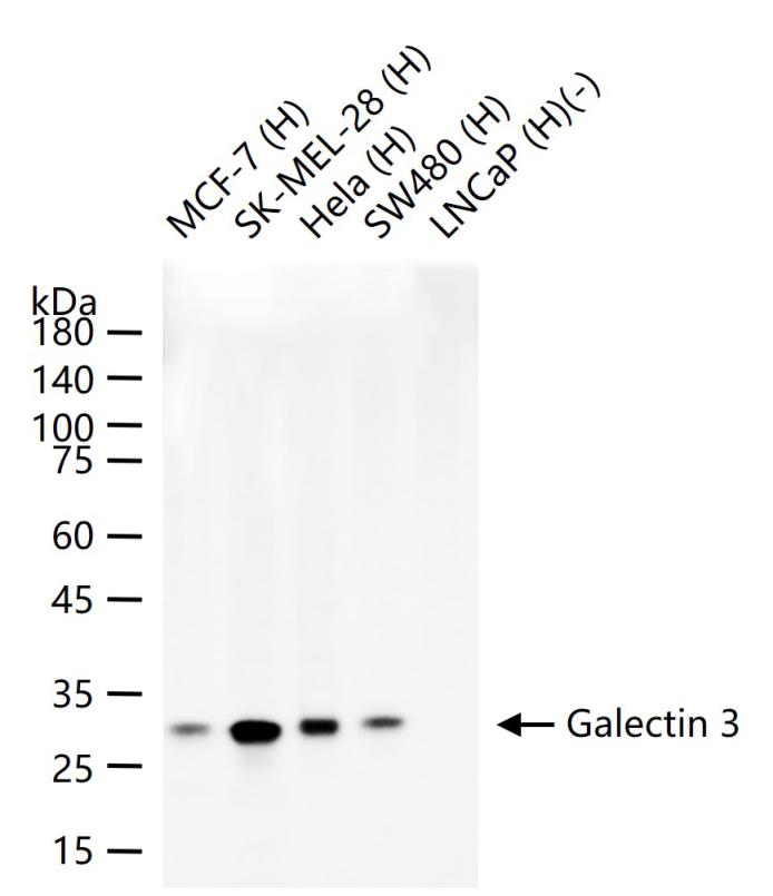 25 ug total protein per lane of various lysates (see on figure) probed with Galectin 3 monoclonal antibody, unconjugated (bsm-33248M) at 1:1000 dilution and 4°C overnight incubation. Followed by conjugated secondary antibody incubation at r.t. for 60 min.