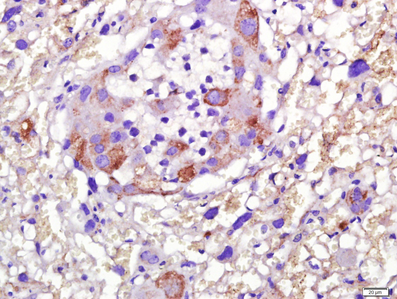 Paraformaldehyde-fixed, paraffin embedded (Mouse placenta); Antigen retrieval by boiling in sodium citrate buffer (pH6.0) for 15min; Block endogenous peroxidase by 3% hydrogen peroxide for 20 minutes; Blocking buffer (normal goat serum) at 37°C for 30min; Antibody incubation with (eNOS/NOS-3) Monoclonal Antibody, Unconjugated (bsm-33176M) at 1:400 overnight at 4°C, followed by a conjugated secondary (sp-0023) for 20 minutes and DAB staining.
